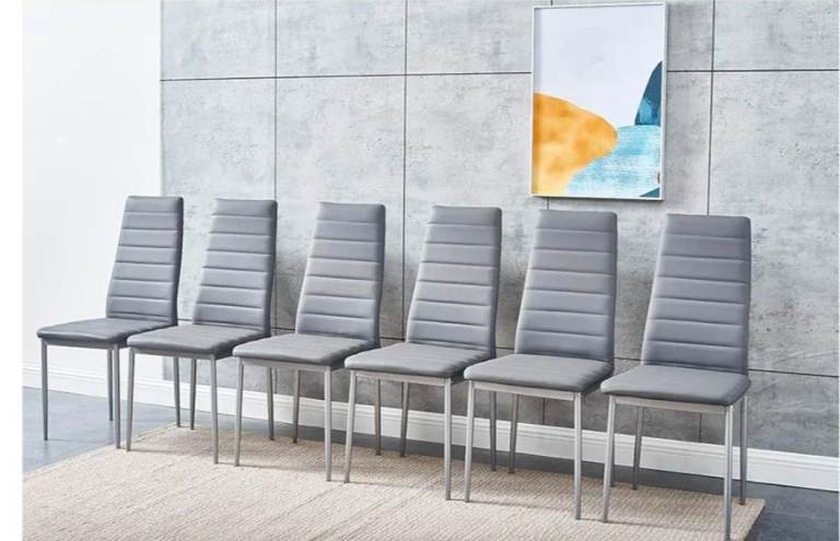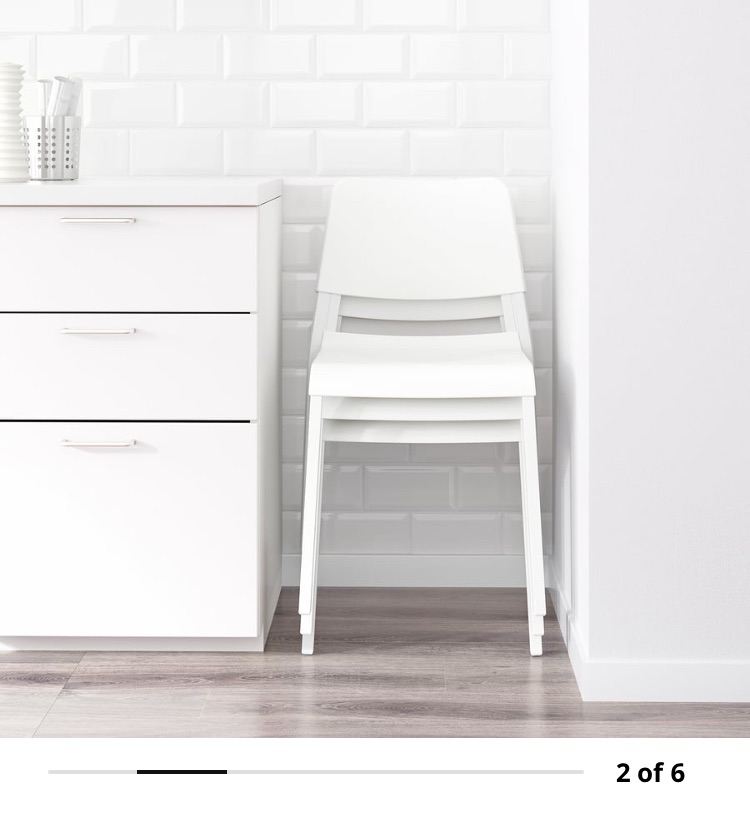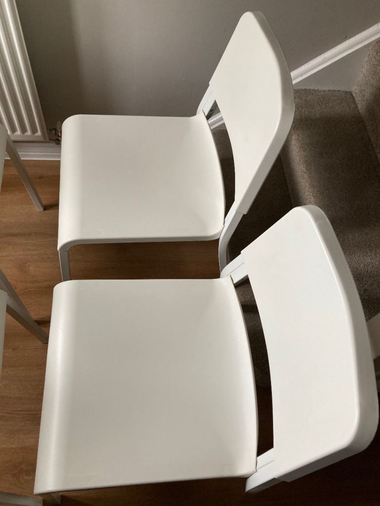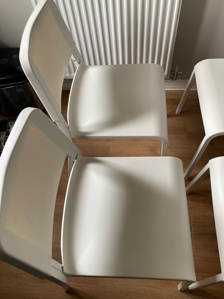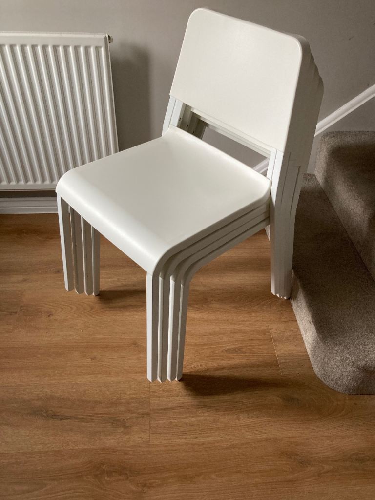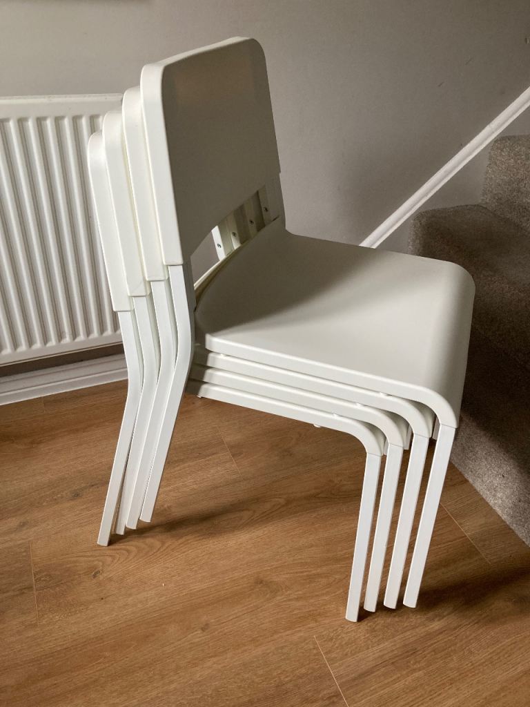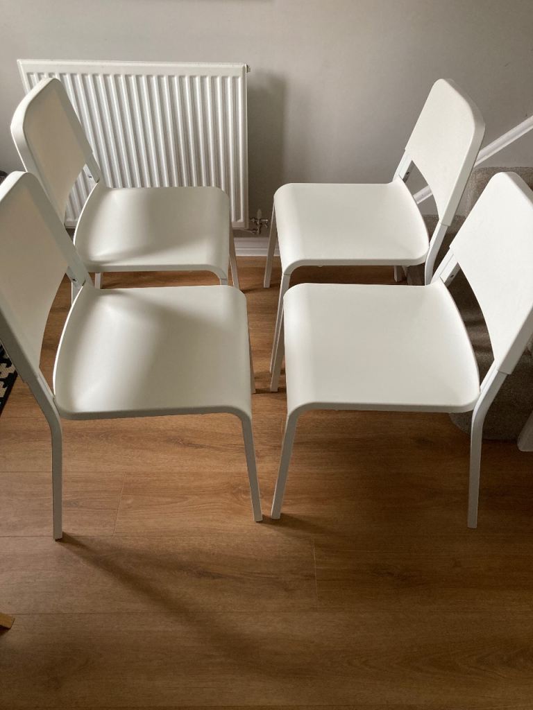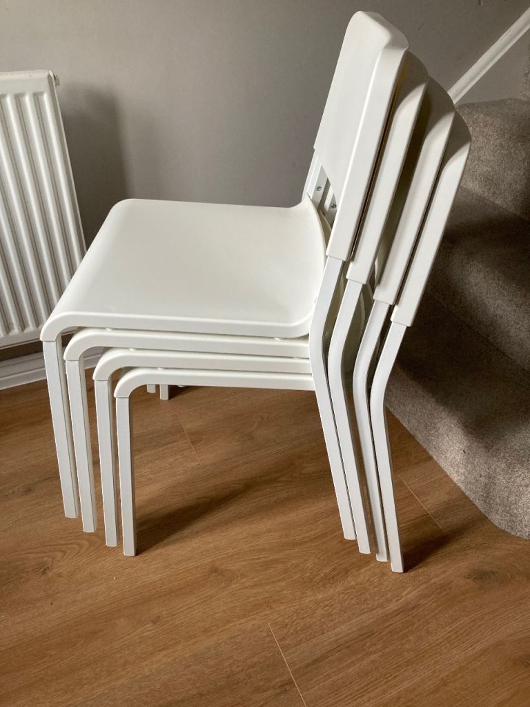 4 white, stackable, strong dining chairs with steel legs and frame and sturdy polypropylene seats.