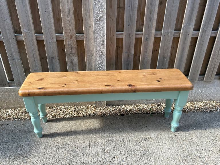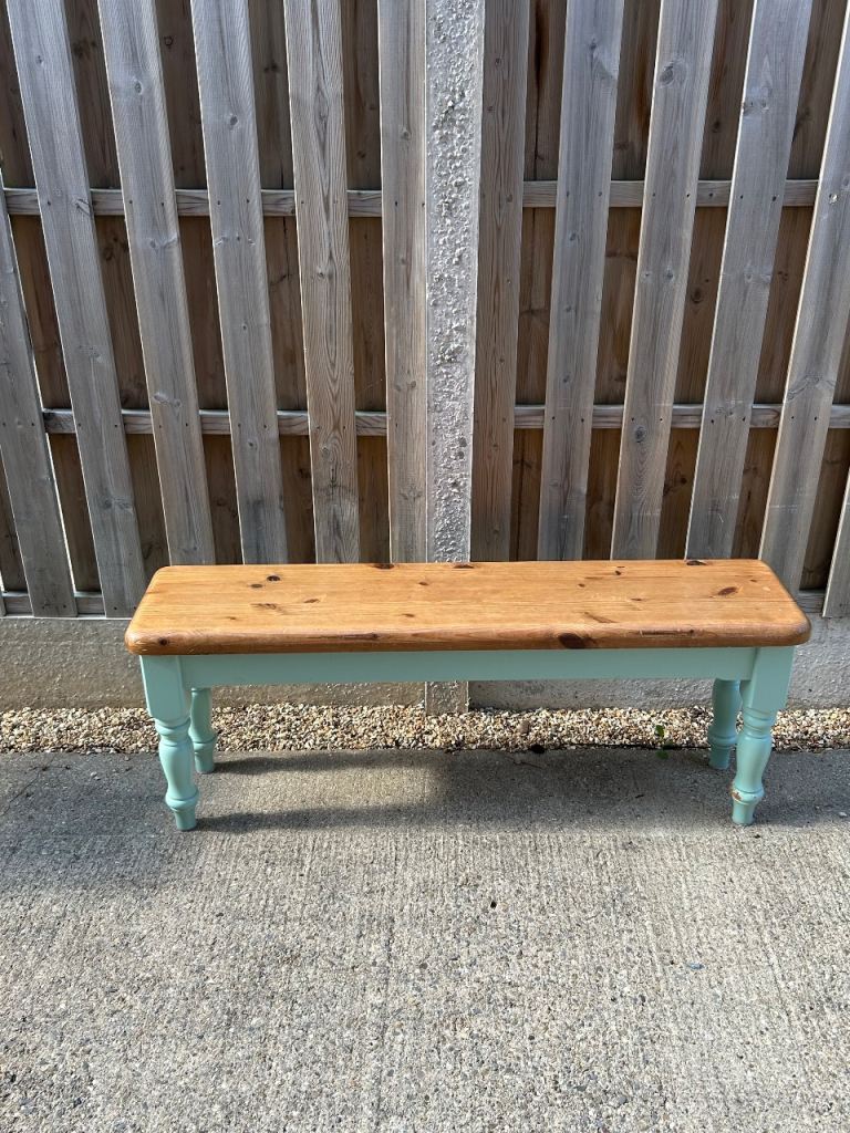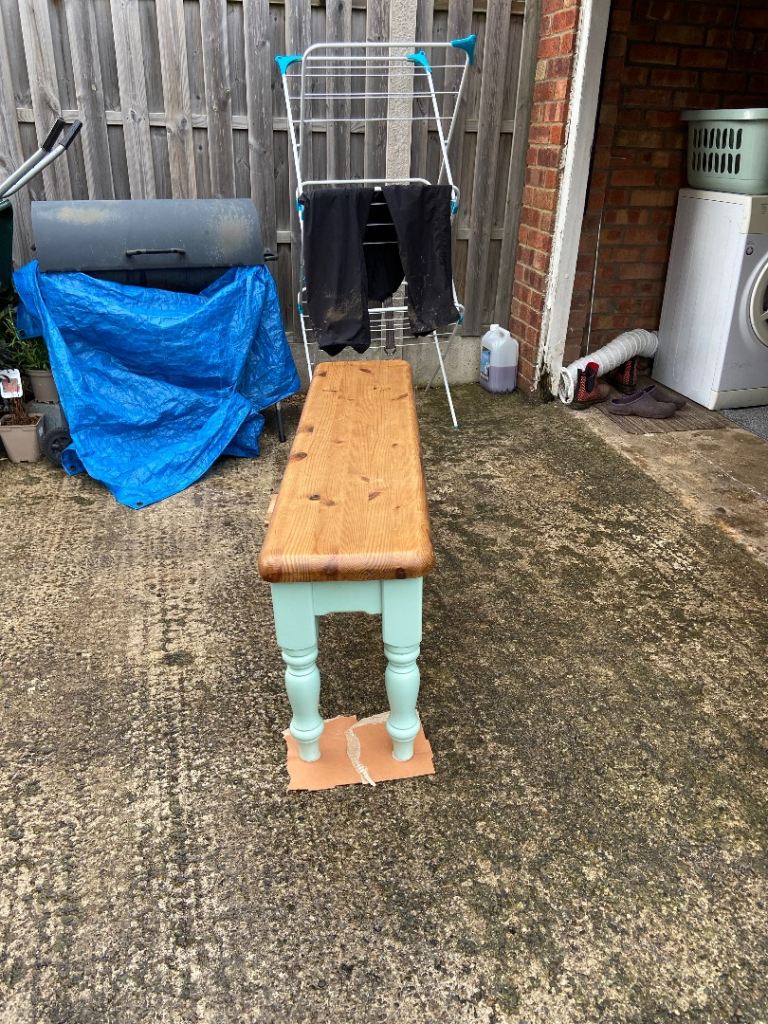 Kitchen bench. 1 foot wide by 4 foot long. Waxed top and painted base pantry green.