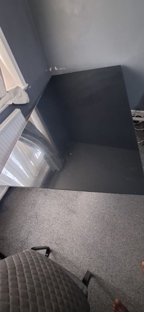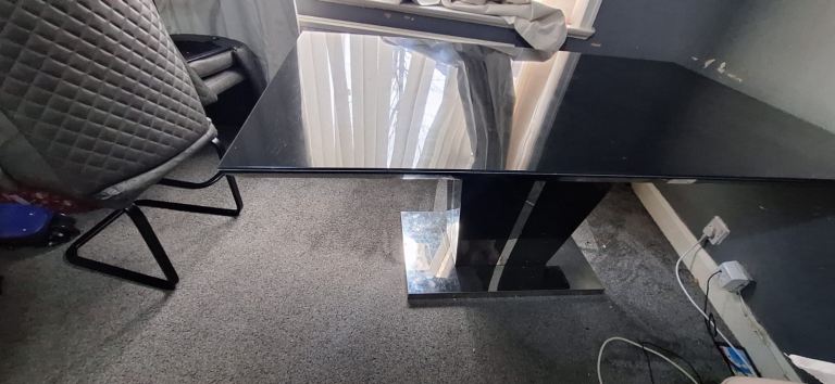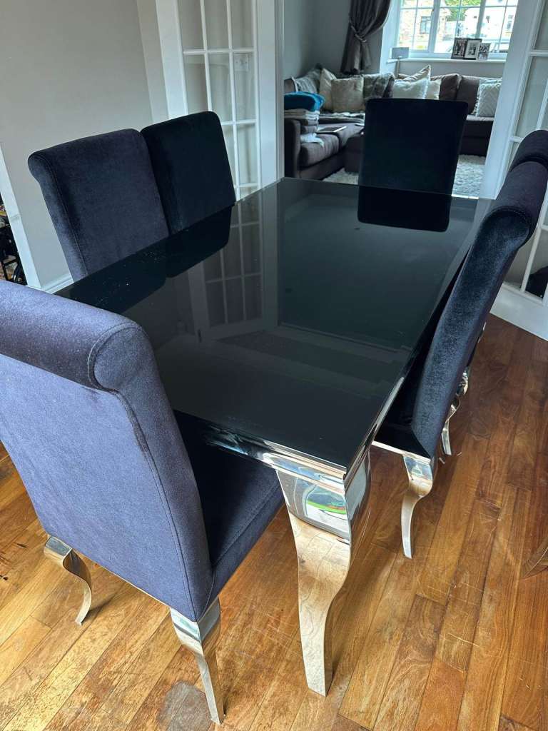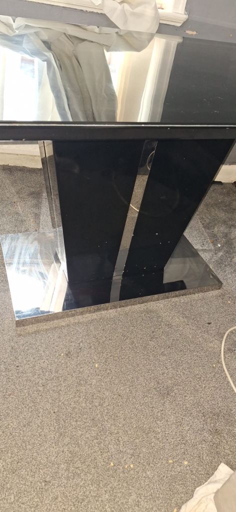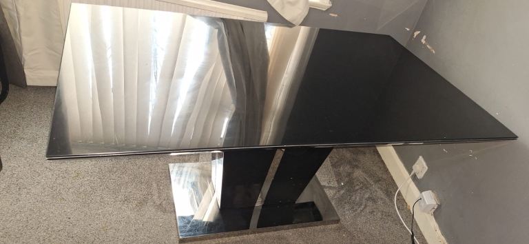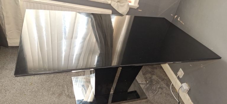 Upgrade your dining space with this stunning contemporary dining table featuring a sleek black glass top and a bold mirrored pedestal base. Perfect for modern homes and easy to match with any décor.