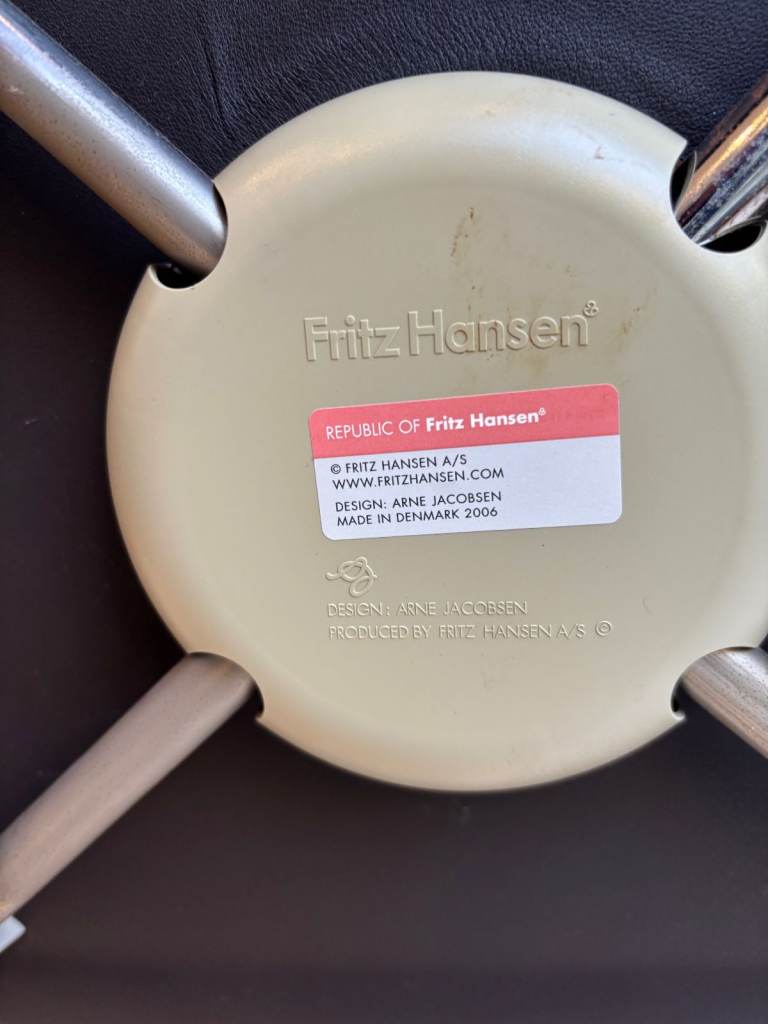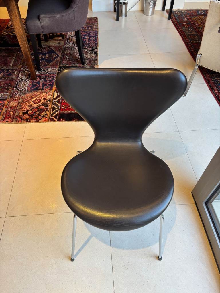These are authentic Fritz Hansen Series 7 chairs, featuring moulded seats upholstered in brown leather with bronze-finished legs. A timeless design classic suitable for dining rooms, offices, restaurants, or design interiors.