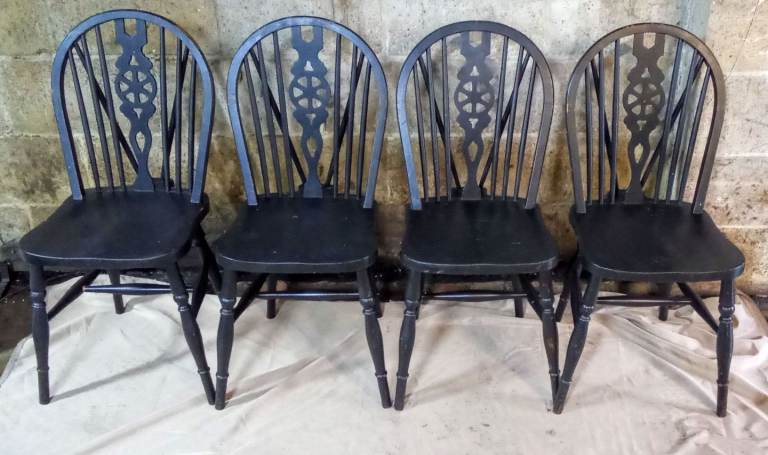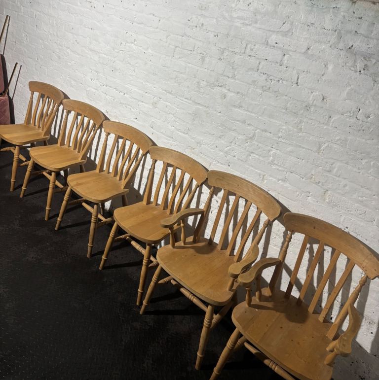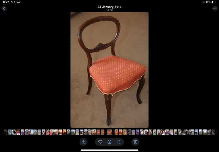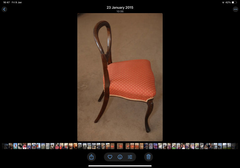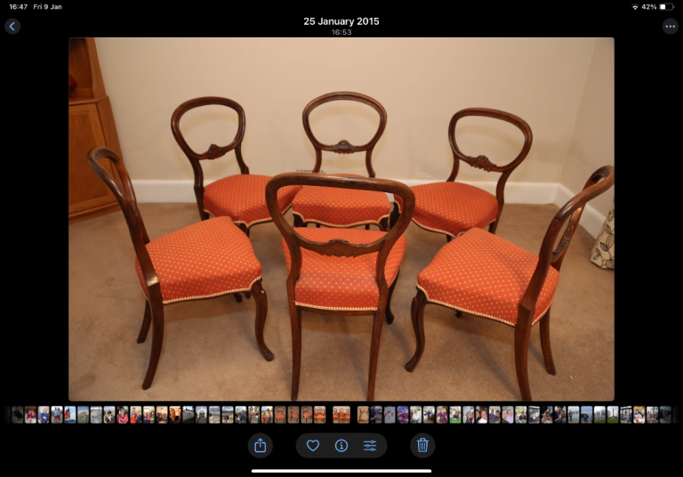 I have for sale a set of six Victorian Balloon Bow Backed Chairs with a Red Fabric Covering. The Chairs are made of Mahogany and are in good condition