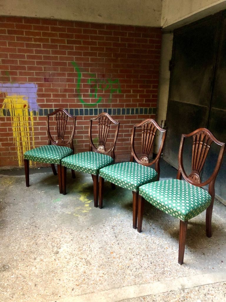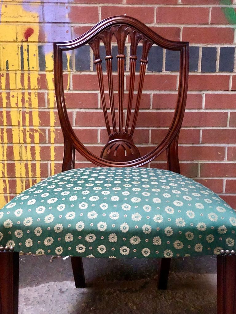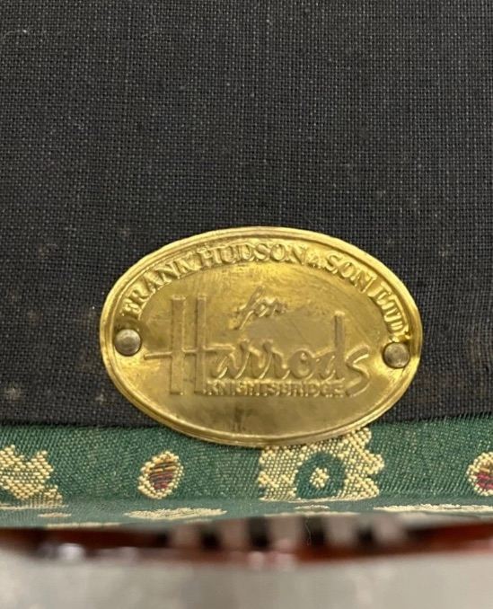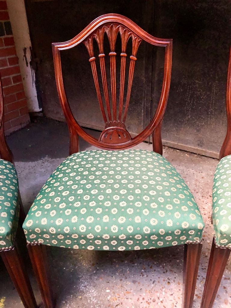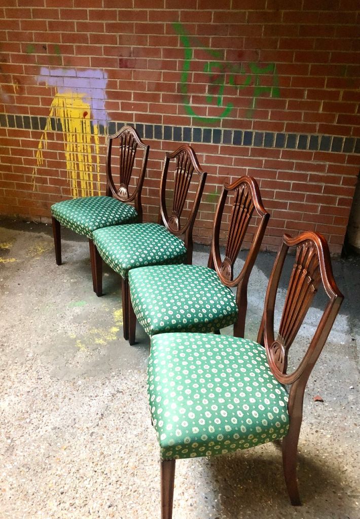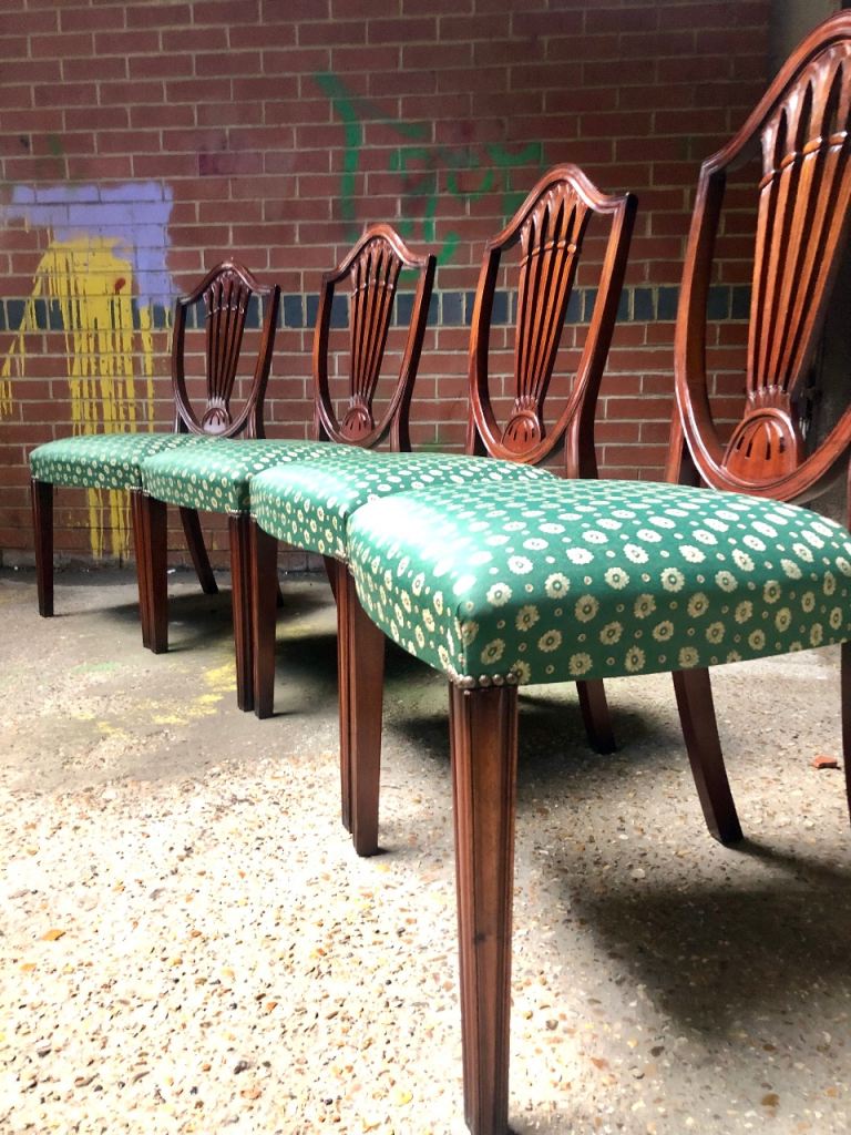Stunning set of 4 Frank Hudson & Sons dining chairs from Harrods Of Knightsbridge. Beautiful rich wood with a lovely green and gold fabric. 100cm high 55 wide and 45 deep. Excellent condition throughout. Item located Camden NW1. Can delivery locally.