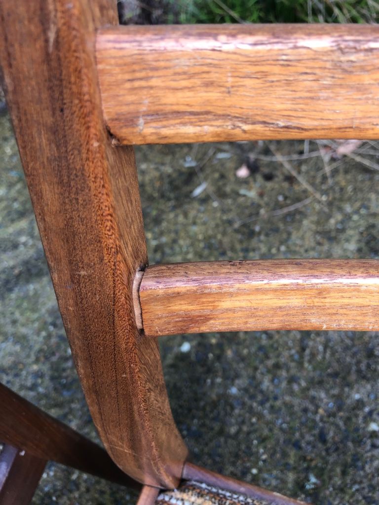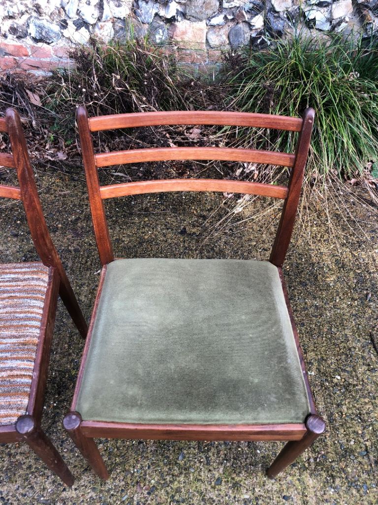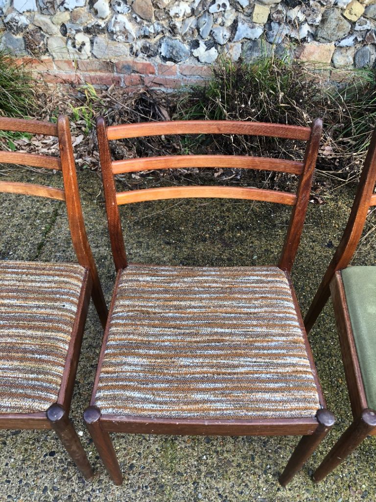 Please note: The chair with the green seat pad is the only chair that needs to be glued at the seat/leg joint and the back joints need gluing and clamping. The rest of the chairs just need cleaning and polishing to bring back to life.