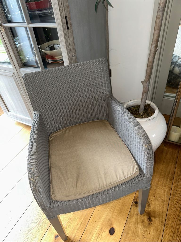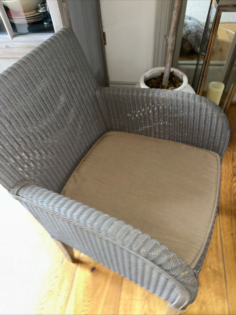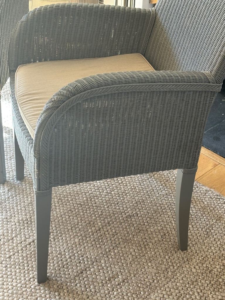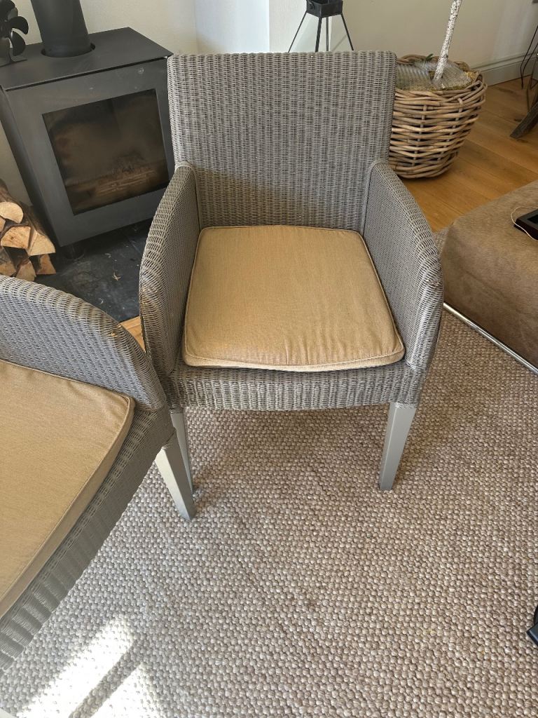 They are mid grey with a taupe colour padded cushion. Small scratches on the rattan as they were moved but can be touched up easily.very solid and comfortable. Price per chair £50