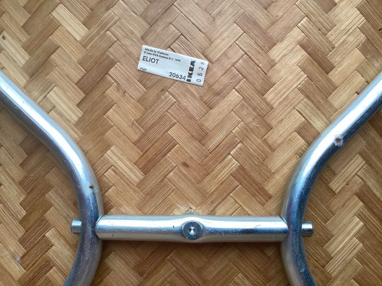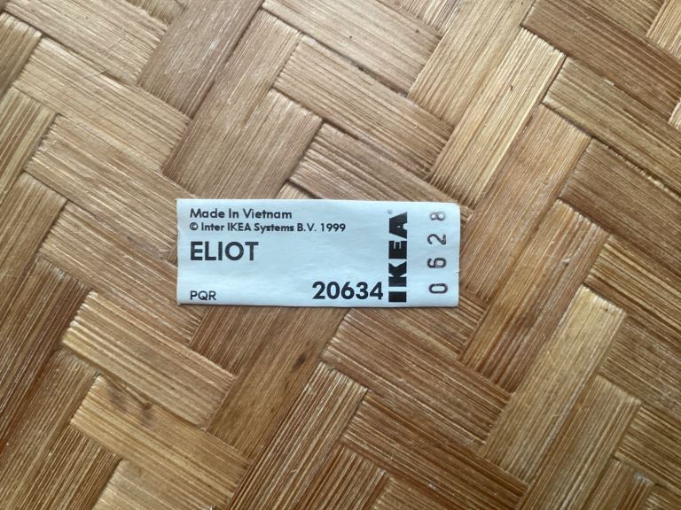 Pair of vintage IKEA ‘Eliot’ stacking dining chairs. Wood covered with bamboo pattern, metal legs. Good used condition, some very small bits of bamboo missing. Will sell separately for £25 each.