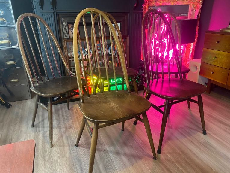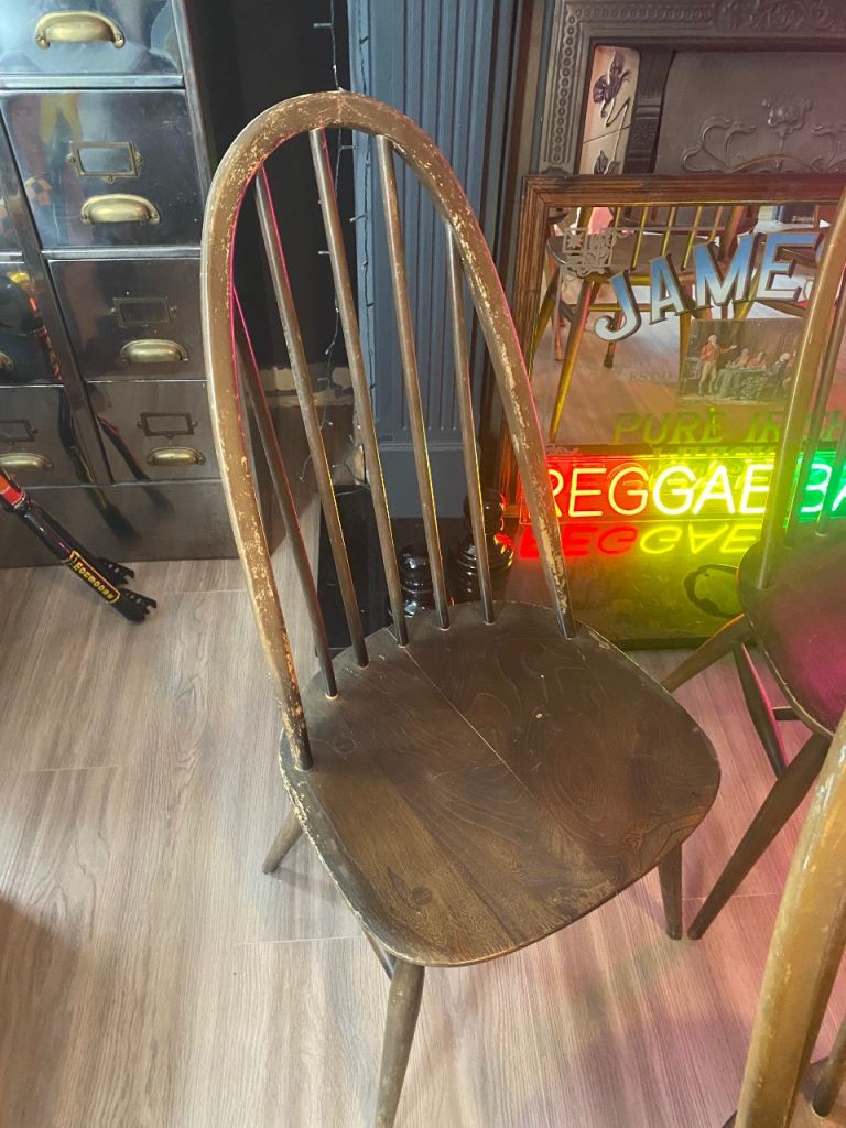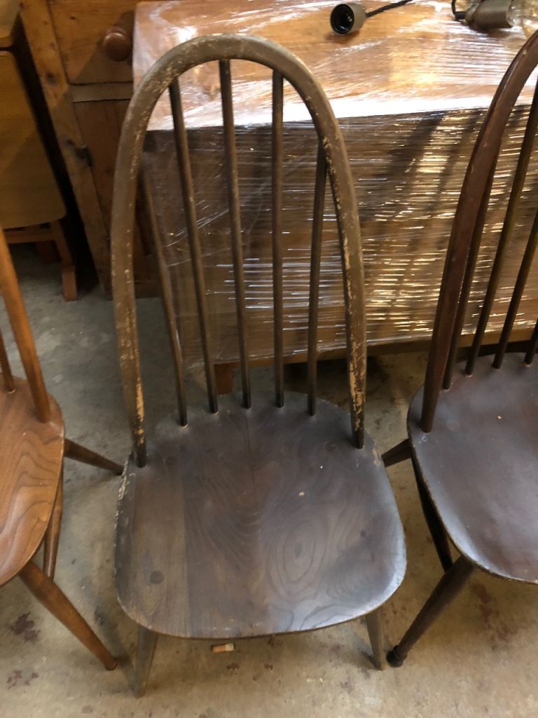 X 6 MID-CENTURY Ercol Windsor BLUE LABEL DINING CHAIRS ,IDEAL UP-CYCLE ,PAINT ,EASY HOME D.I.Y REPAIR,ALL SIX CHAIRS ARE USEABLE AS IS