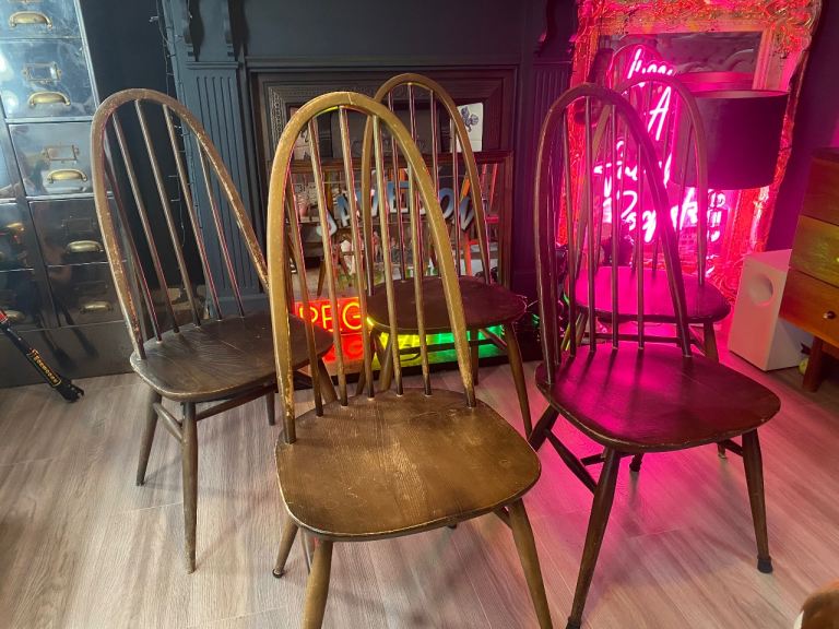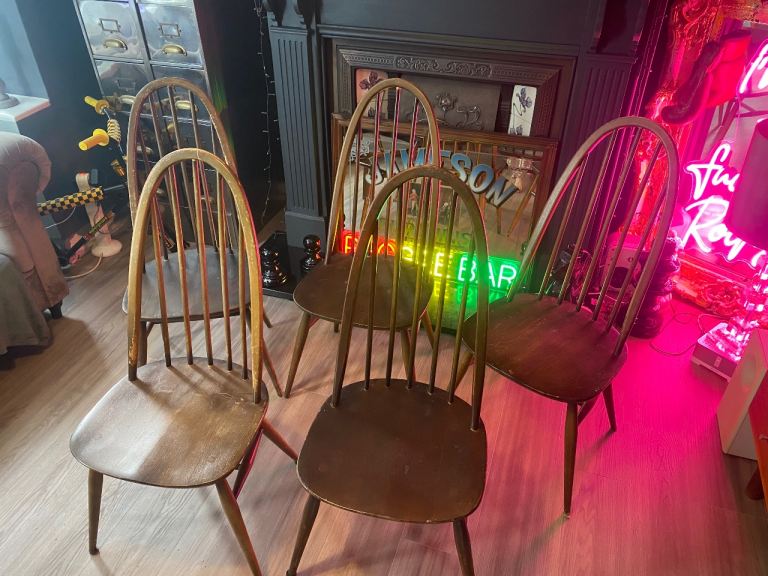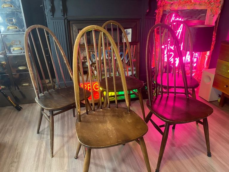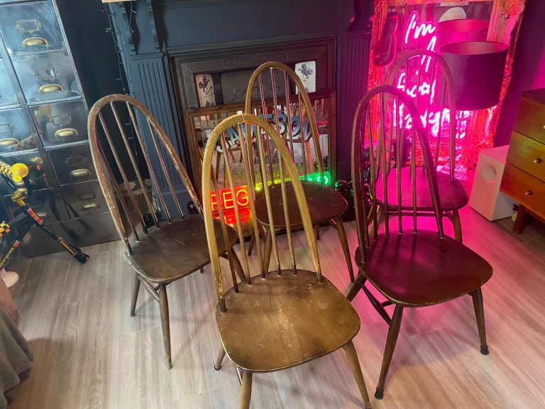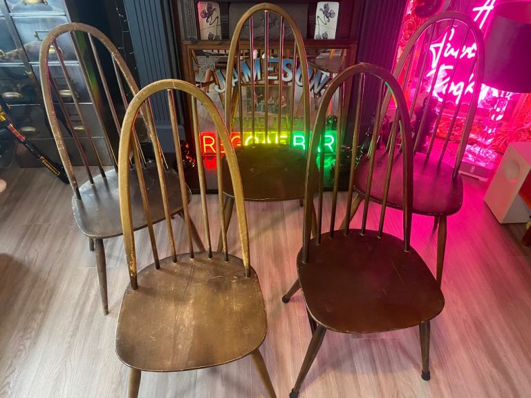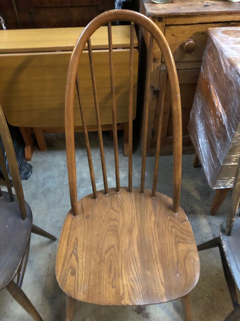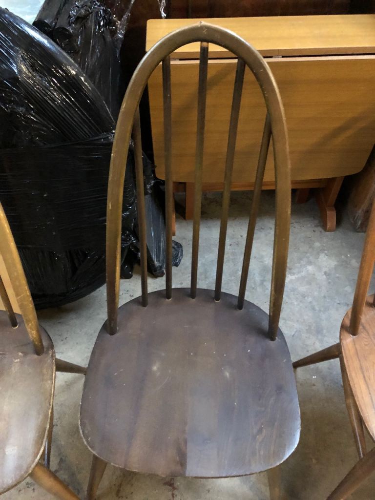 X 6 MID-CENTURY Ercol Windsor BLUE LABEL DINING CHAIRS ,IDEAL UP-CYCLE ,PAINT ,EASY HOME D.I.Y REPAIR,ALL SIX CHAIRS ARE USEABLE AS IS