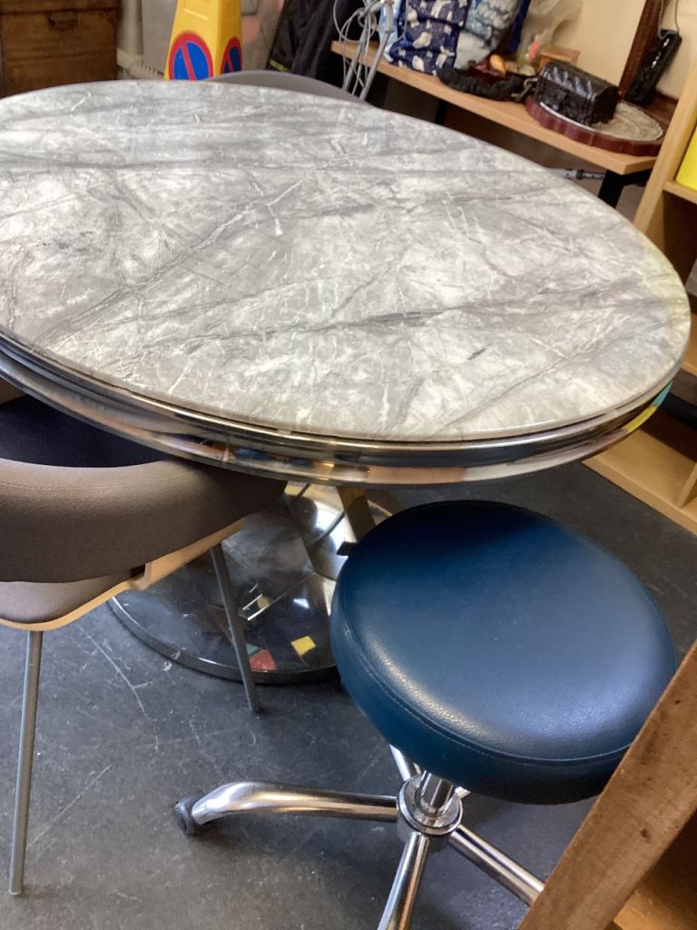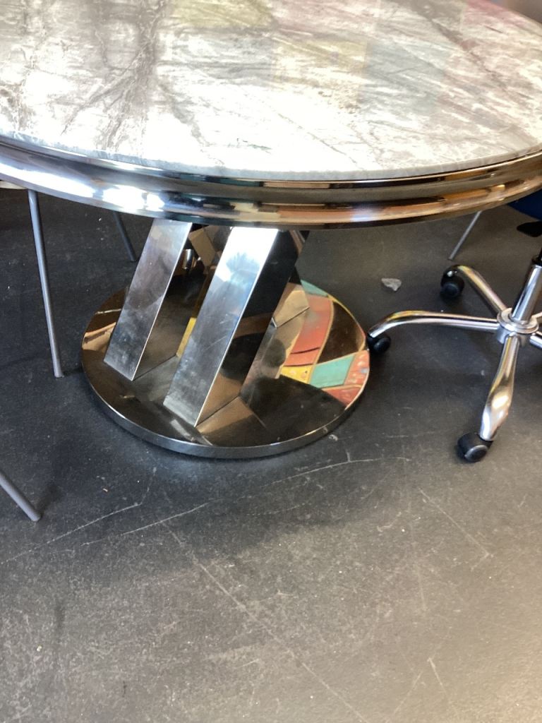 Chrome base chrome very heavy top sits inside of it marble effect has some chippings around the Alta rim of table still usable ideally need some sort of resin or something just to correct it4t