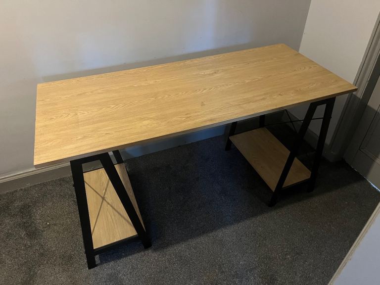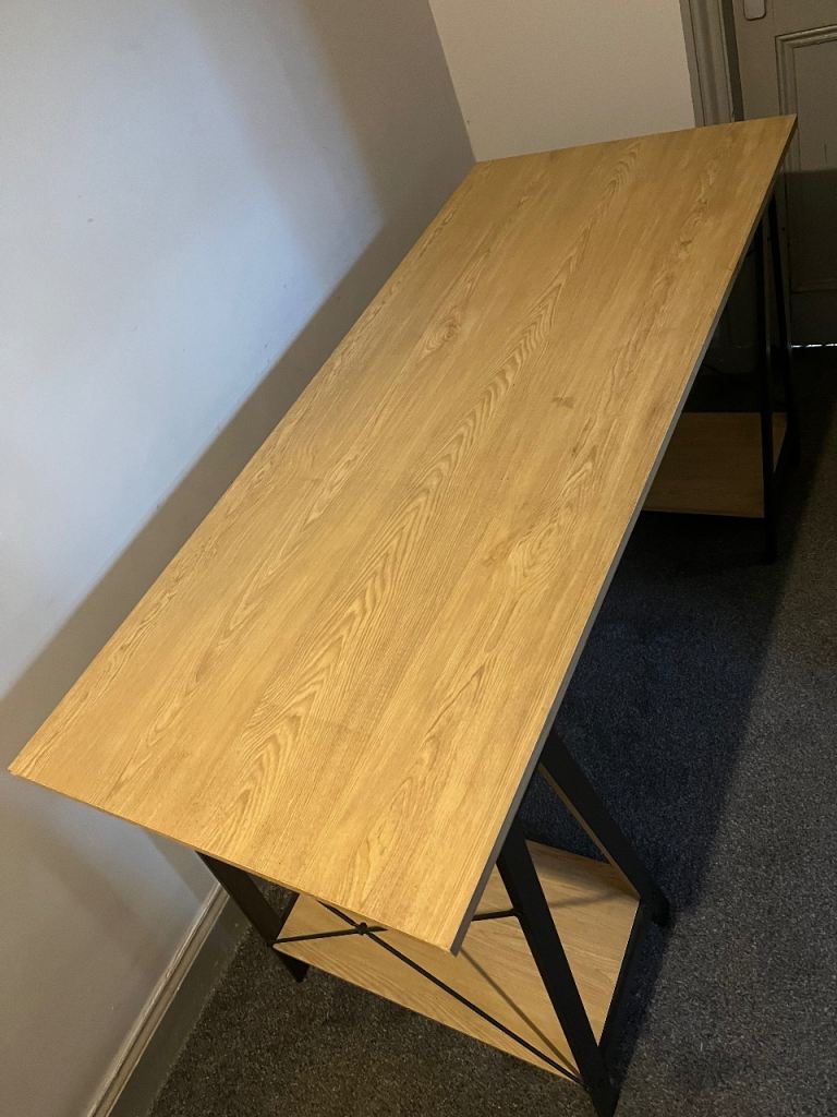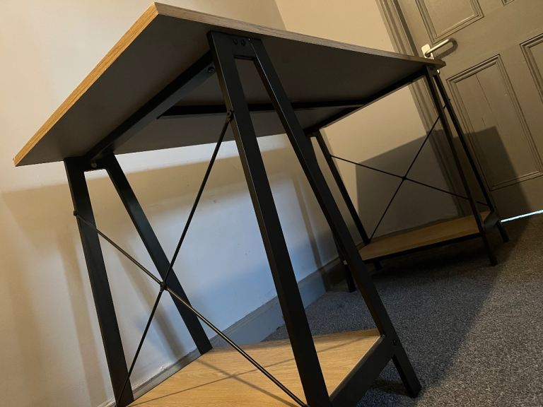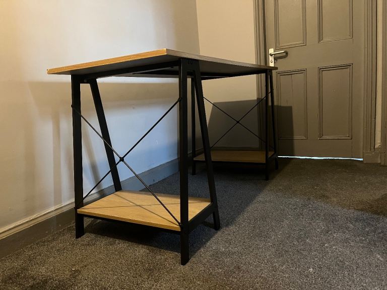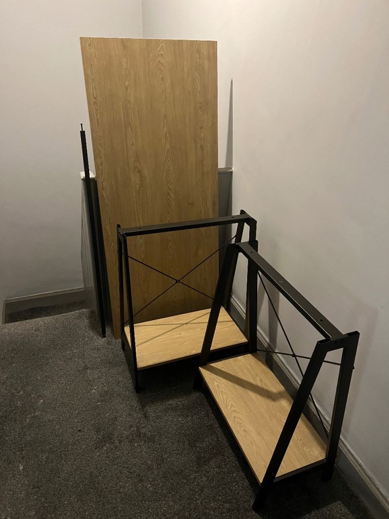 Steel framed load bearing work table. Very solid construction. Hard wearing top and shelves. Very good standing height for working. Height 750mm, width 600mm, length 1400mm. The legs can be disassembled for transport.