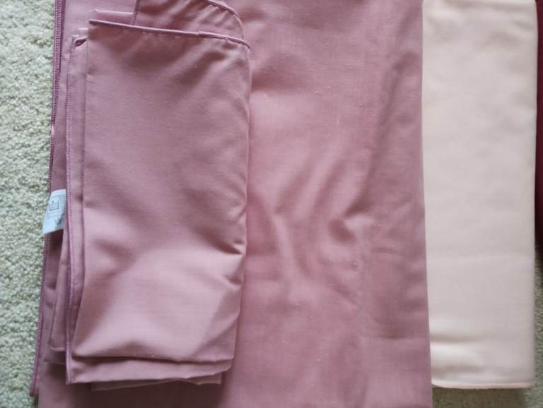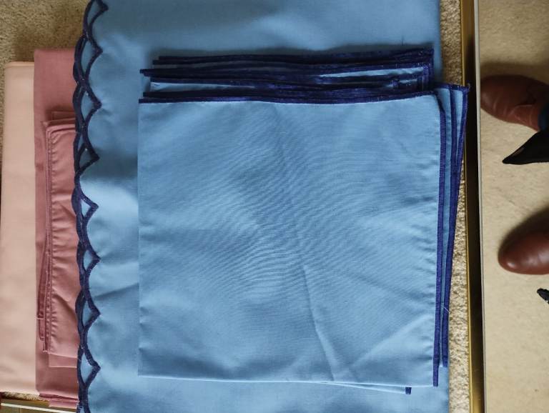 5 table cloths, medium to large size. One pink, one blue, one peach. Two patterned. Serviettes with some. Good condition.