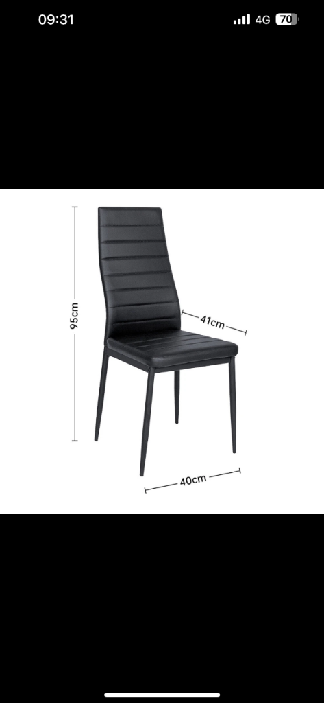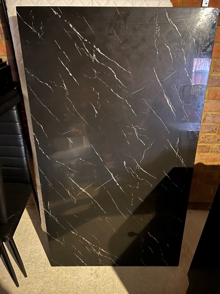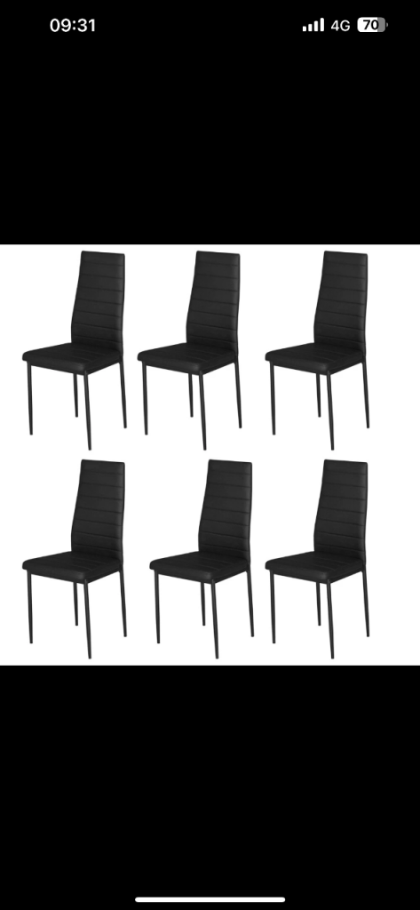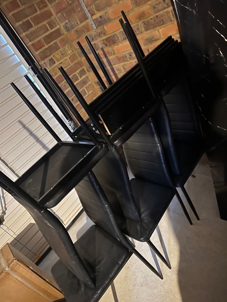 6 chairs black faux leather pvcu. Some marks on chairs also table with 4 legs and all fittings. Currently stored in garage as just been replaced. Collection £50 . Delivery local £60