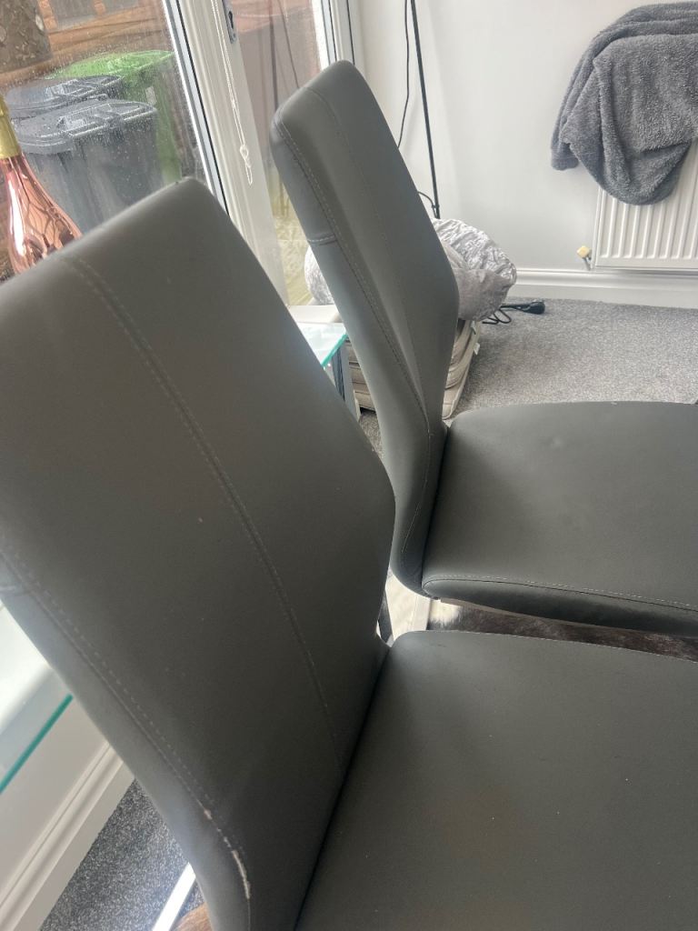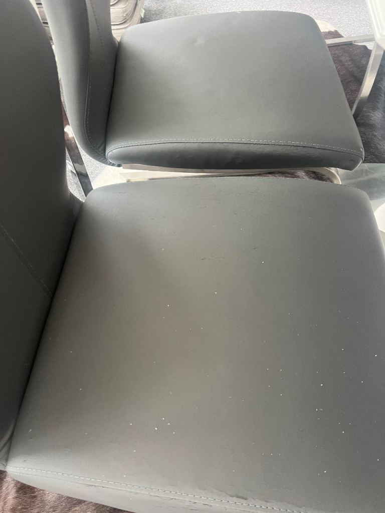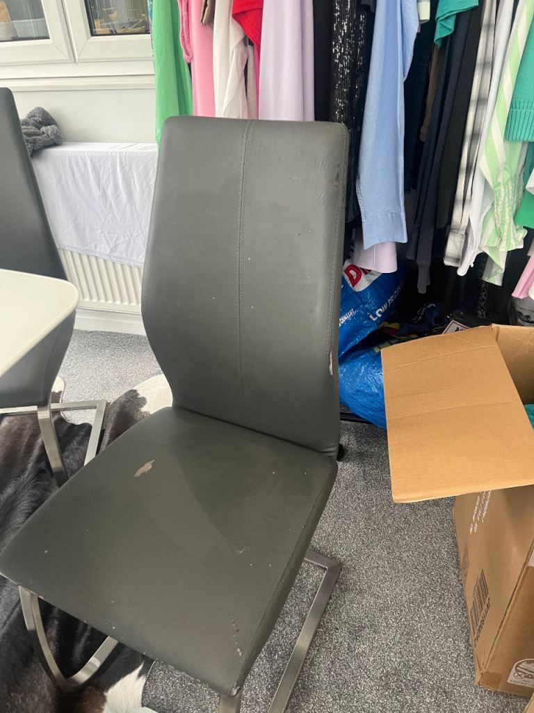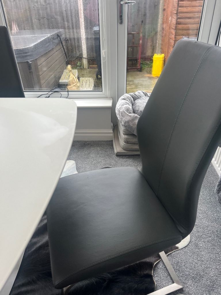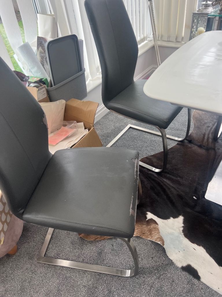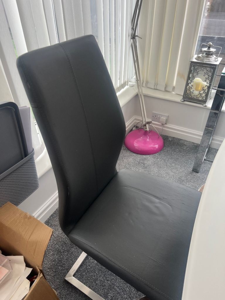 Includes 6 grey faux leather cantilever chairs with chrome legs.