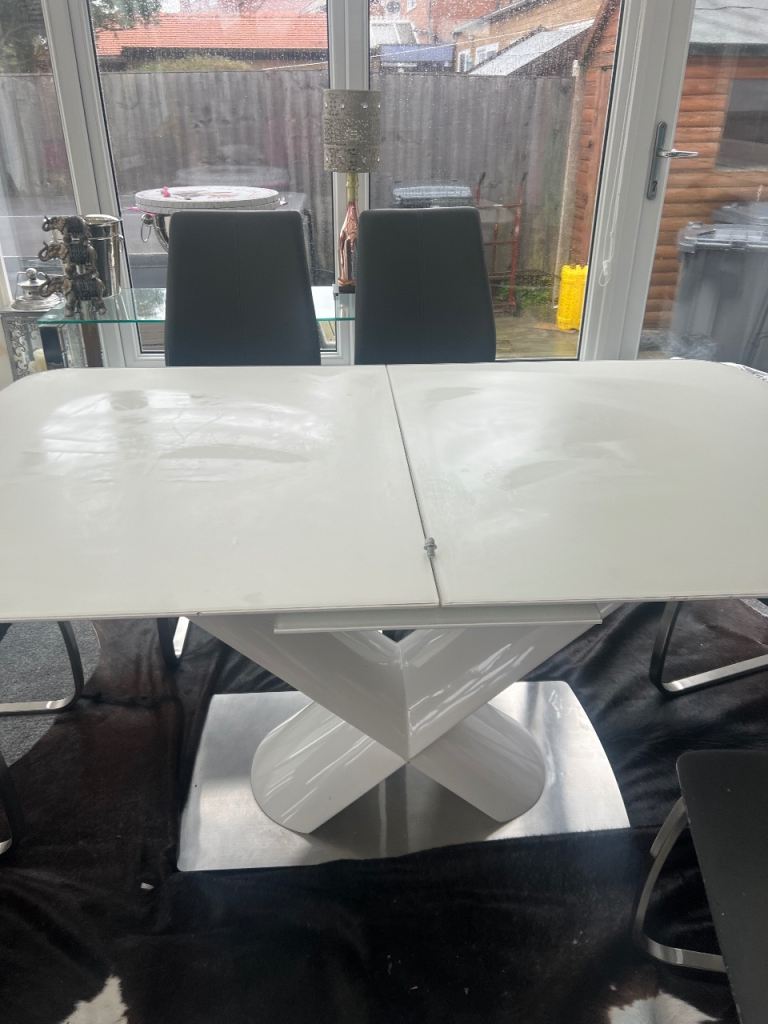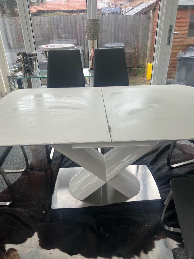 Modern white high gloss dining table with statement pedestal X base. Extends easily to seat up to 8 people.