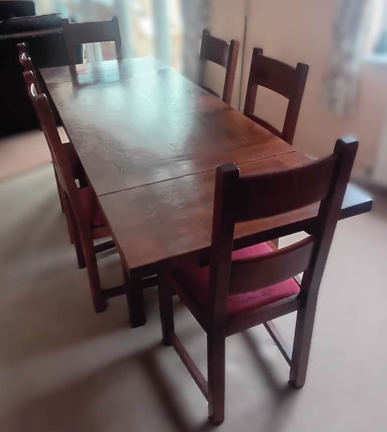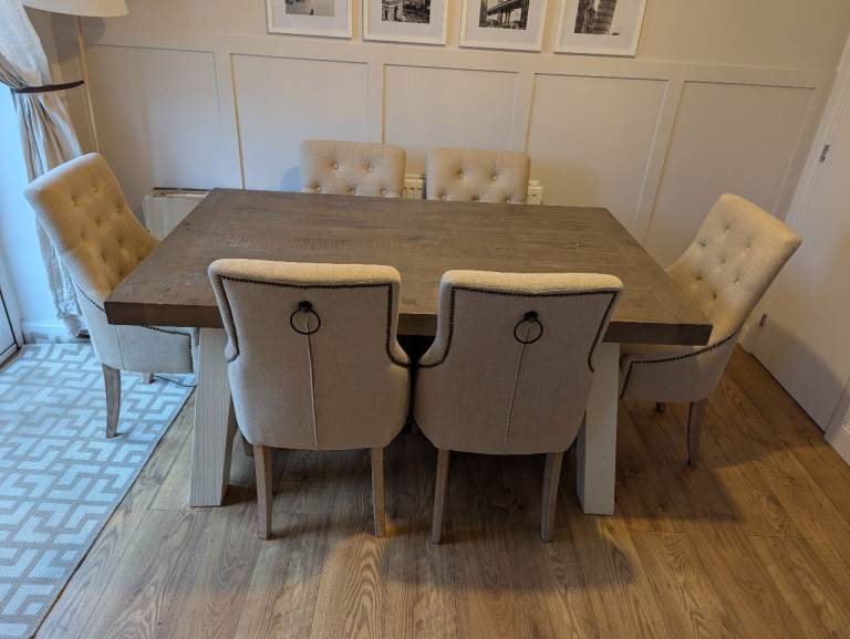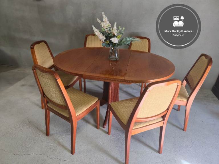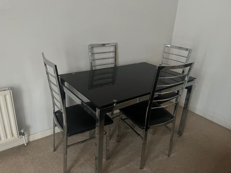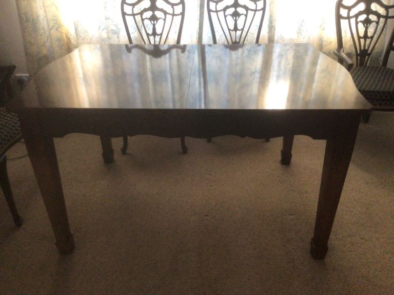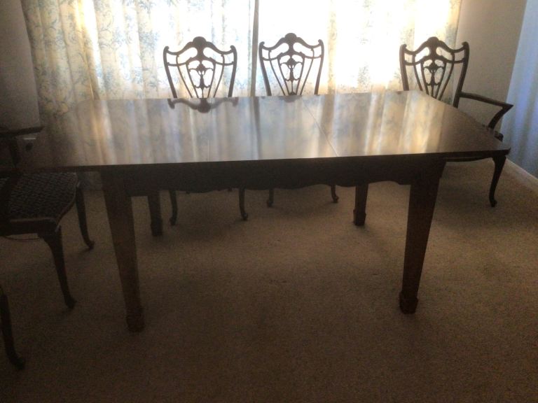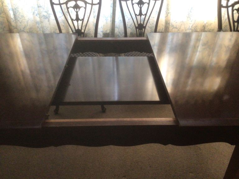 Quality table and chairs. Extendable table (leaf stores with table). Chairs very clean, upholstered in navy fabric.