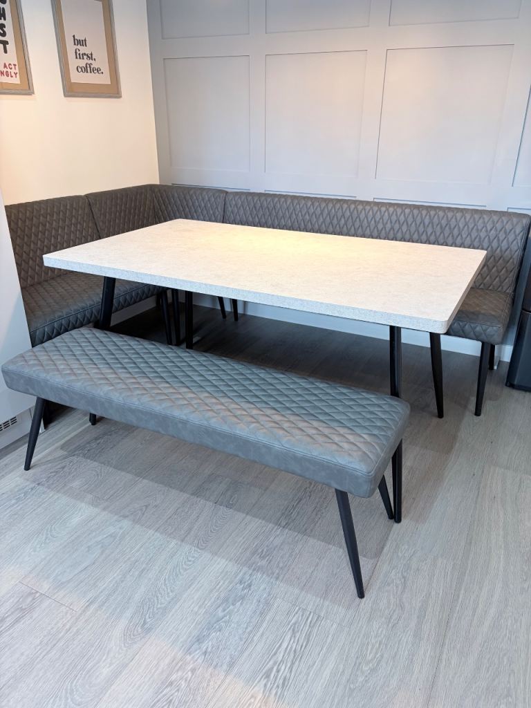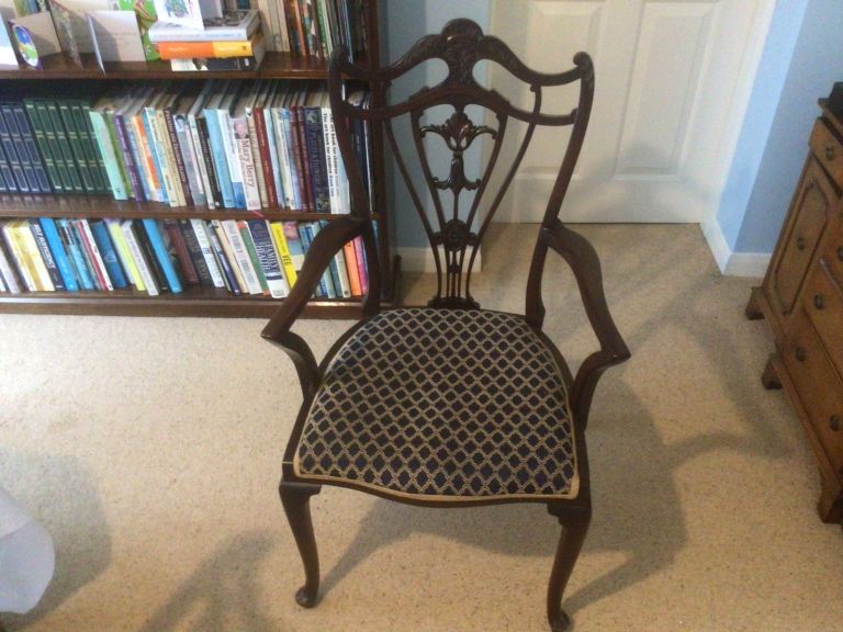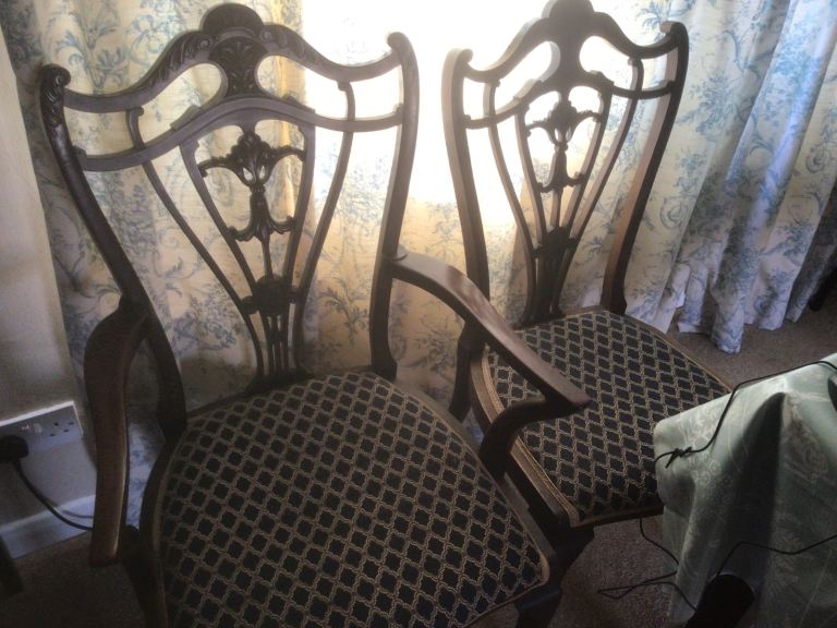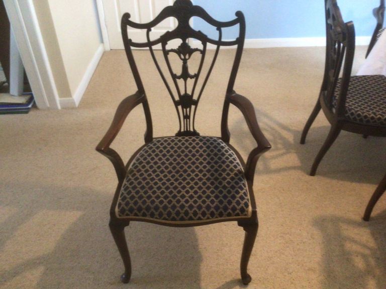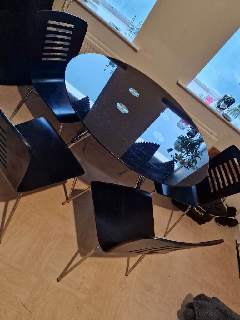 Quality table and chairs. Extendable table (leaf stores with table). Chairs very clean, upholstered in navy fabric.