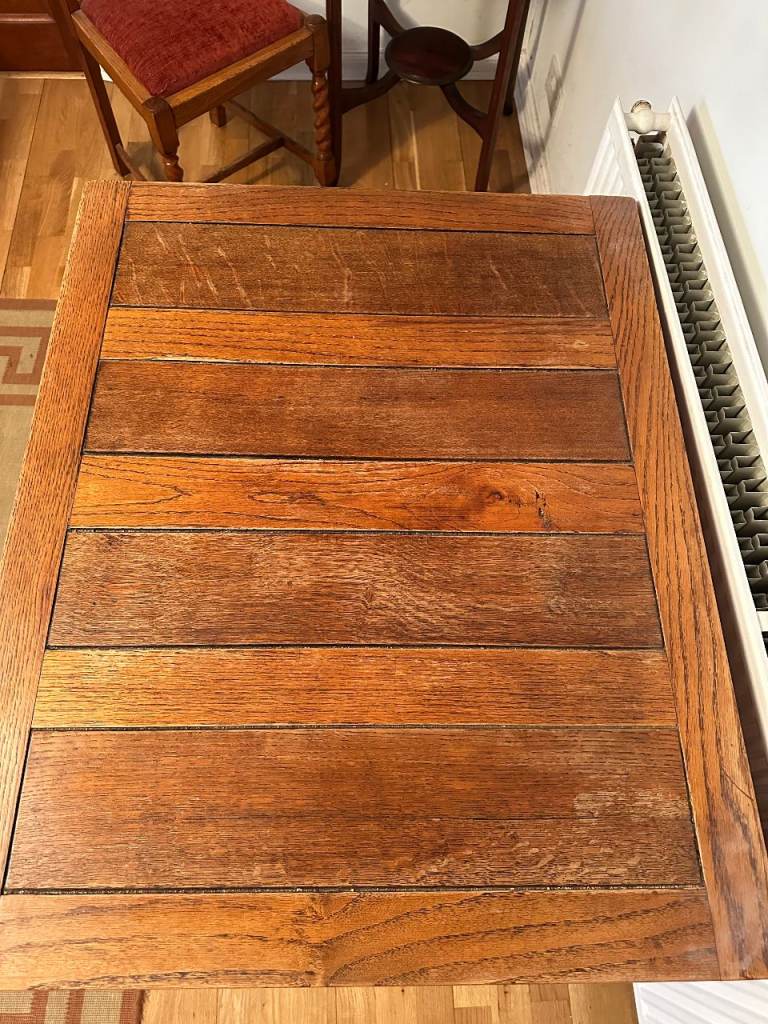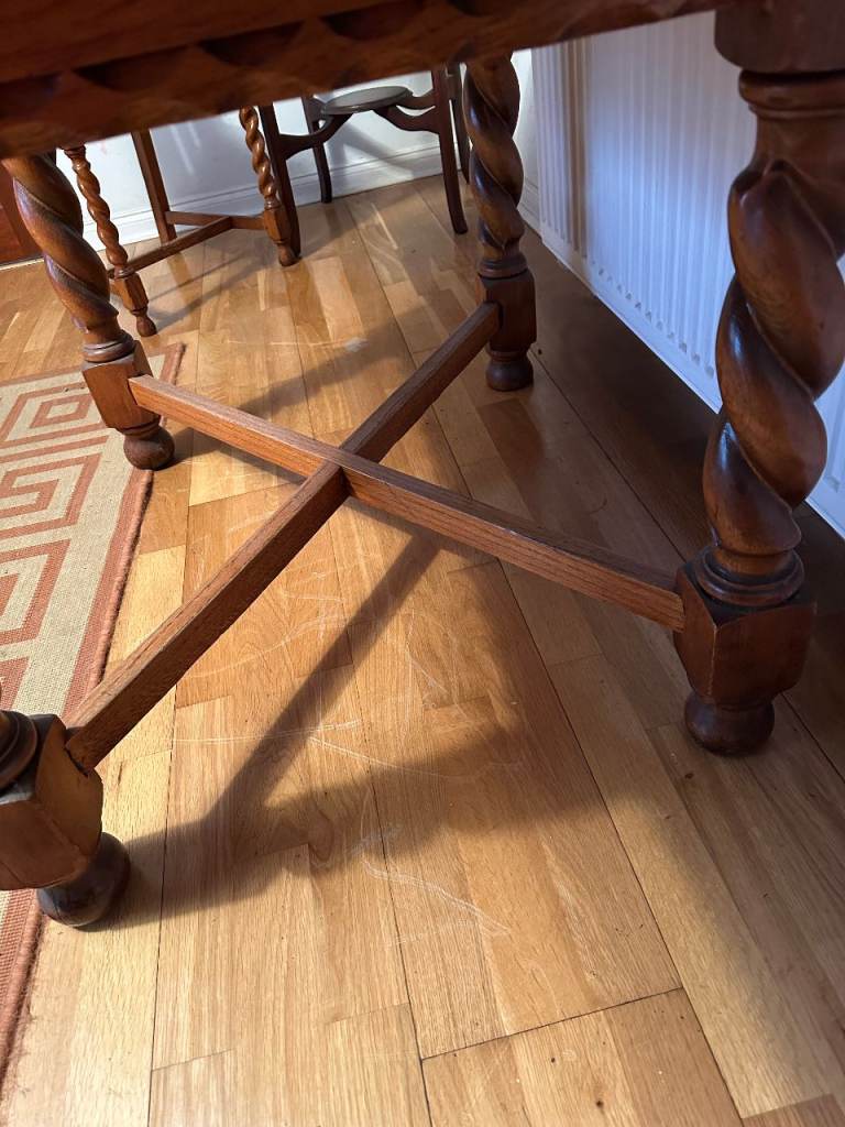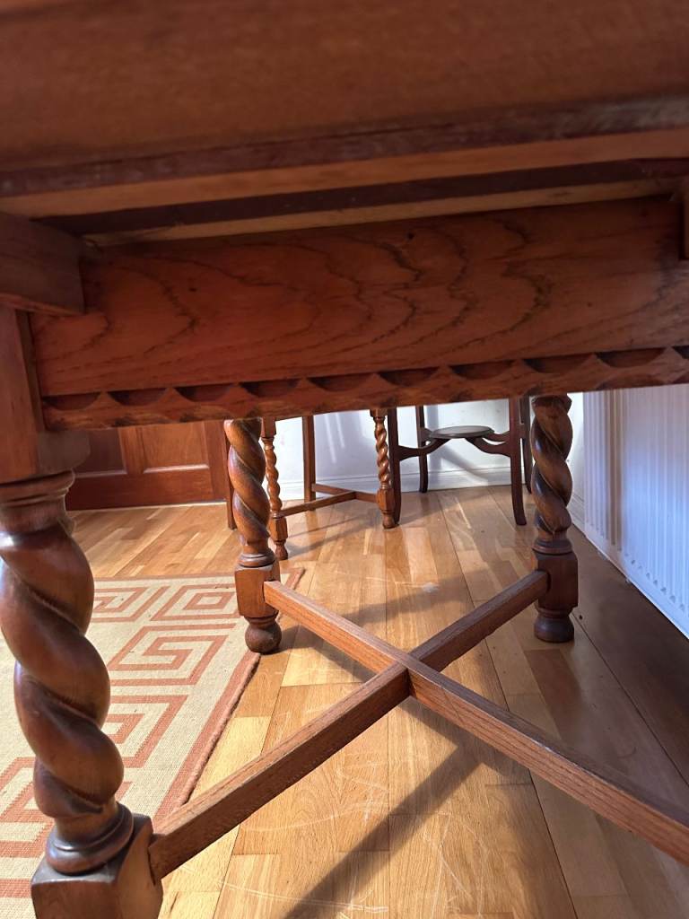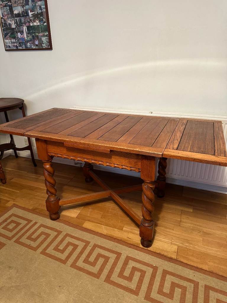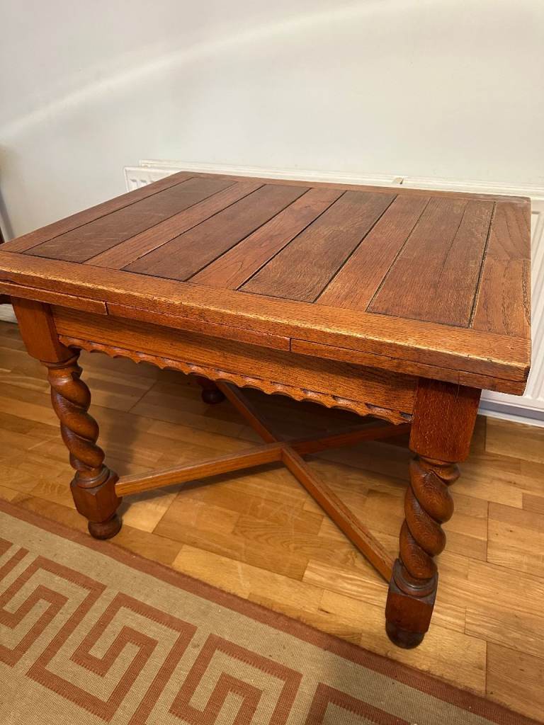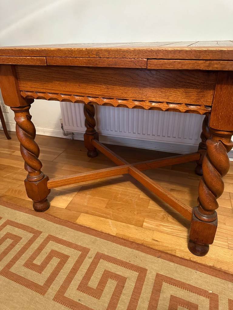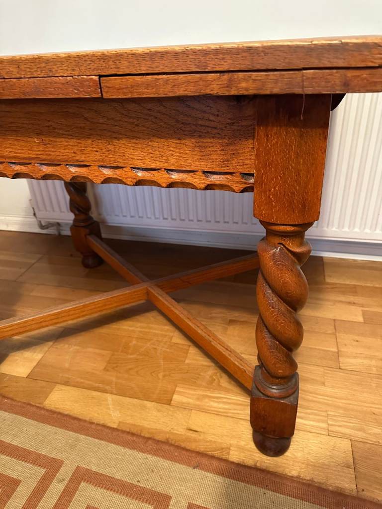 Antique oak barley-twist leg, extending dining table and three chairs. All in generally very good condition, especially considering the age. The table top extends by pulling out the two leaves at each end of the table. Table size 73cm wide x 90cm long, extending to 150cm long when both leaves extended. We also have a free dining chair advertised, it has matching fabric seat, but doesn’t match the other chairs, but may be useful. Asking £300. Any questions please message, or have a look, no obligation to buy. Collection from Fordingbridge. Cash sale only please.