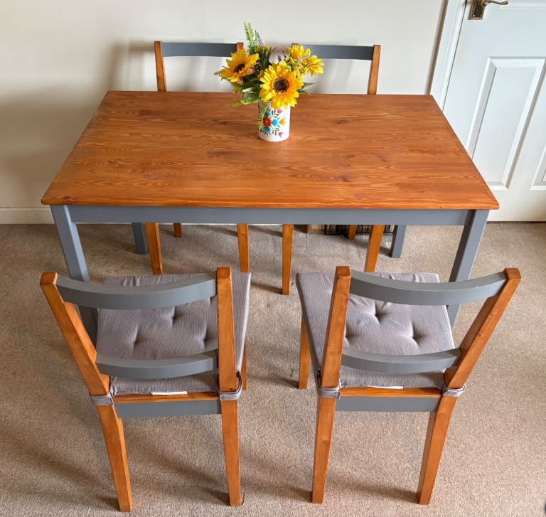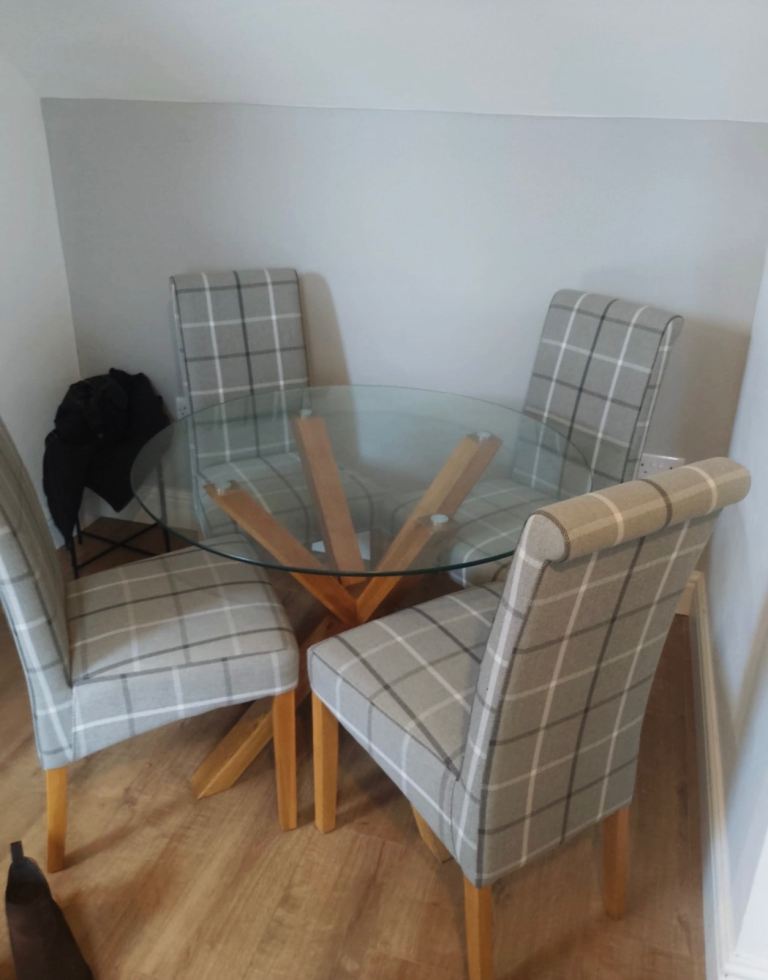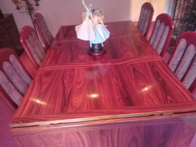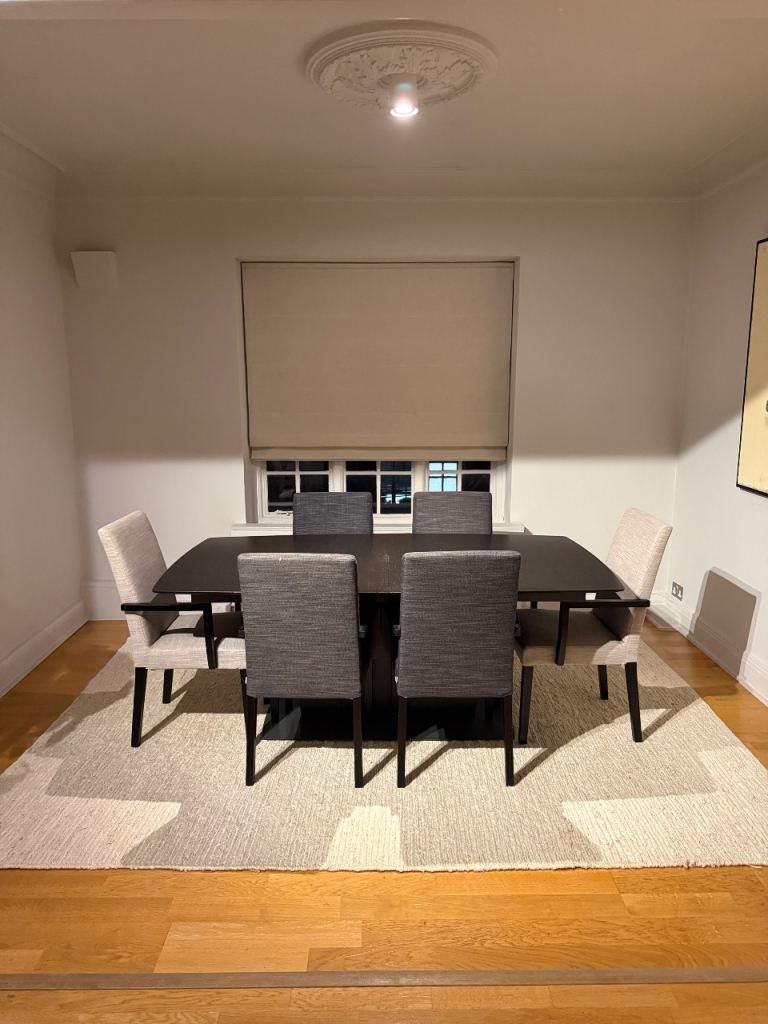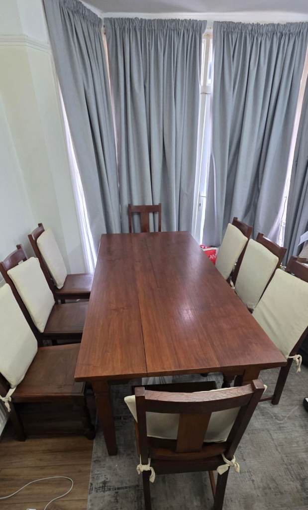 • 8 dining chairs included (mix of grey and beige upholstery)