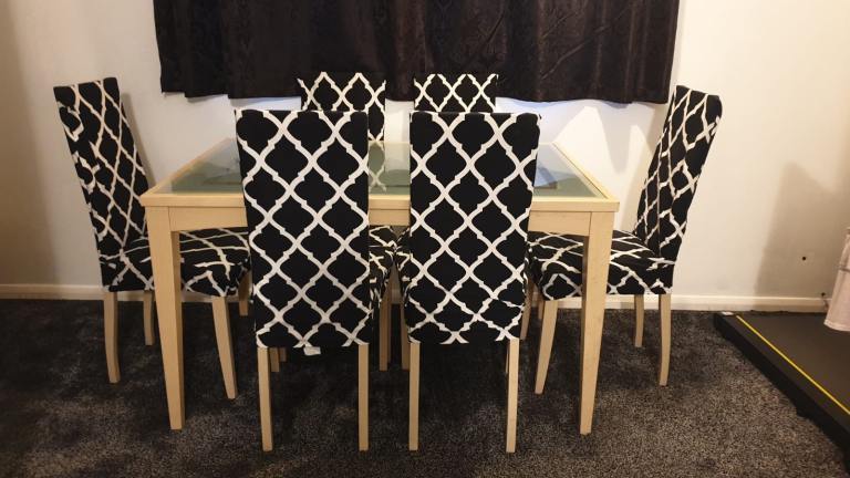 Stylish light wood dining table with glass top and 6 matching high-back chairs. Chairs feature a modern black and white patterned fabric that adds a bold, contemporary touch to any dining space.