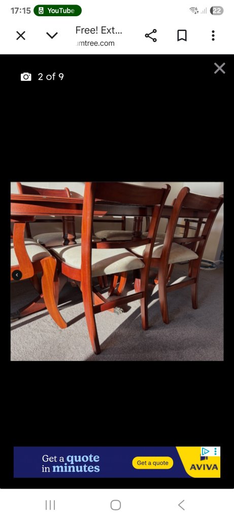 Mahogany dining table that extends with 6 chairs. Probably could do with a revamp but I haven't got the space or time.
