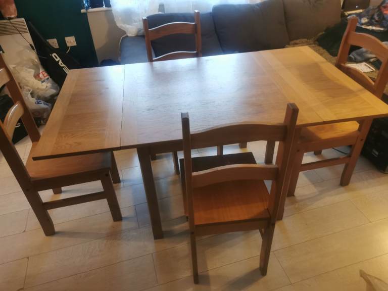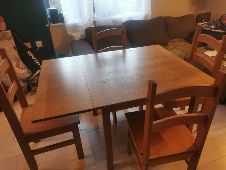 I have for sale extendable wooden dining table and 4 chairs in good used condition measurements are 90x90 cm extend 160x90 high 74 cm