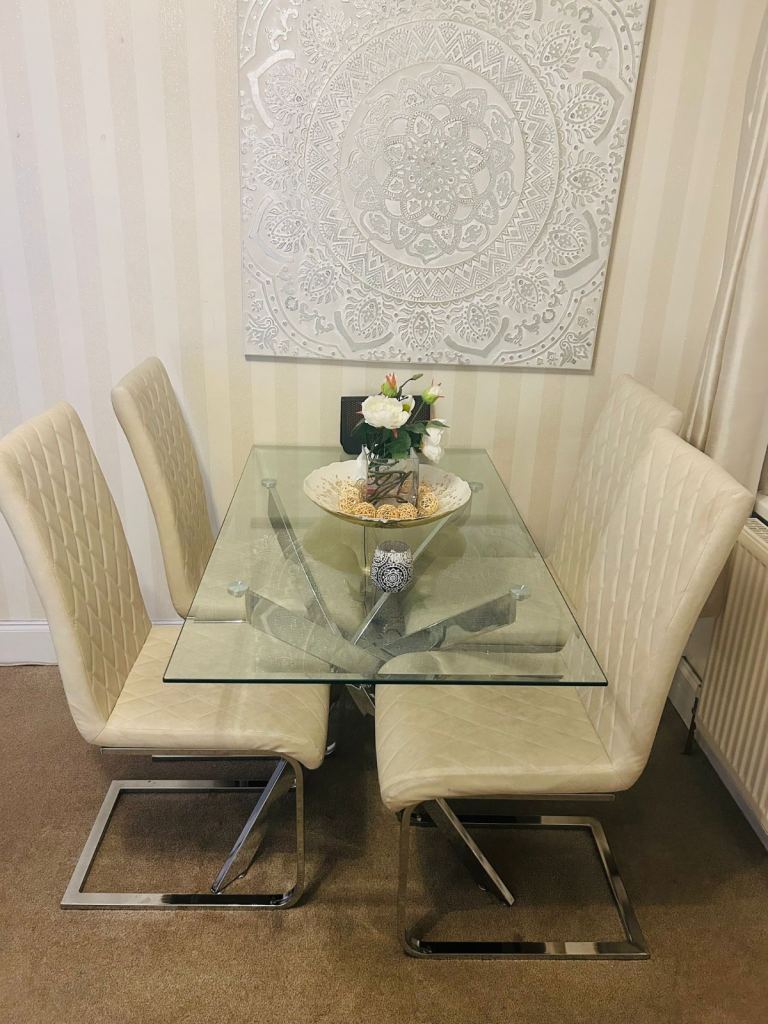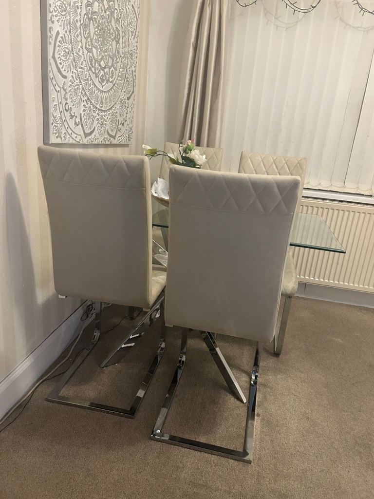 Dining table and chairs bought from Wayfair. Both chairs and table in very good condition. Very much a stylish set but functional at the same time. Smoke free and pet free home. Selling as refurbing living room. £170 O.N.O