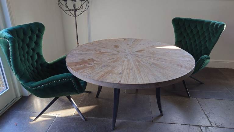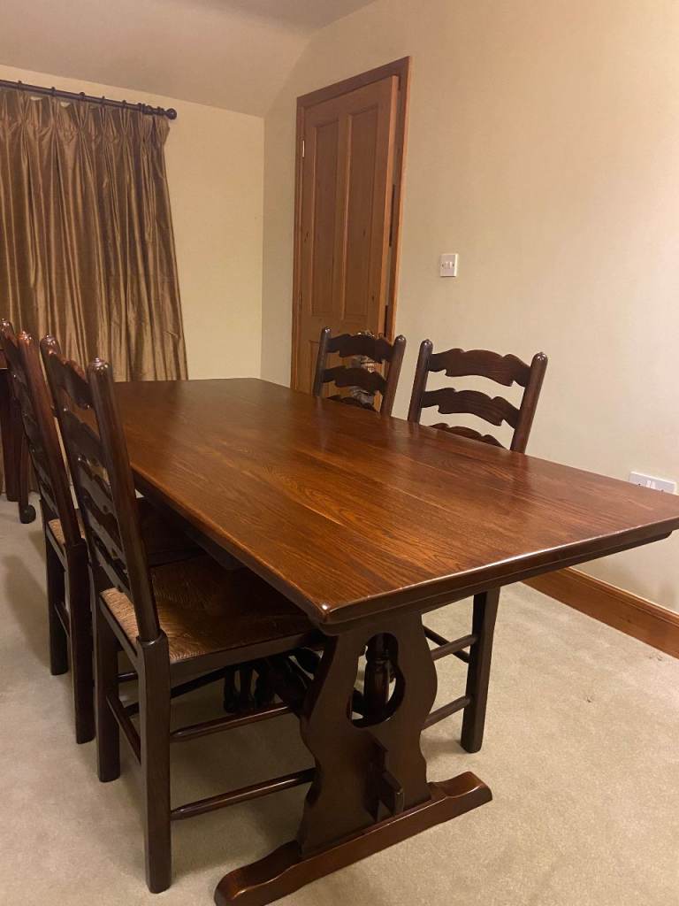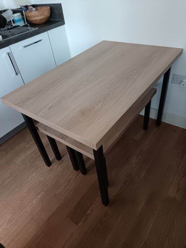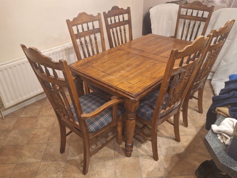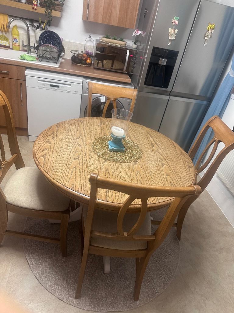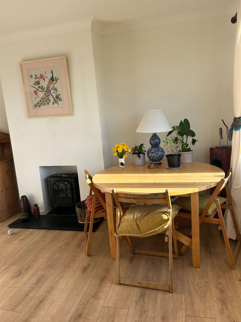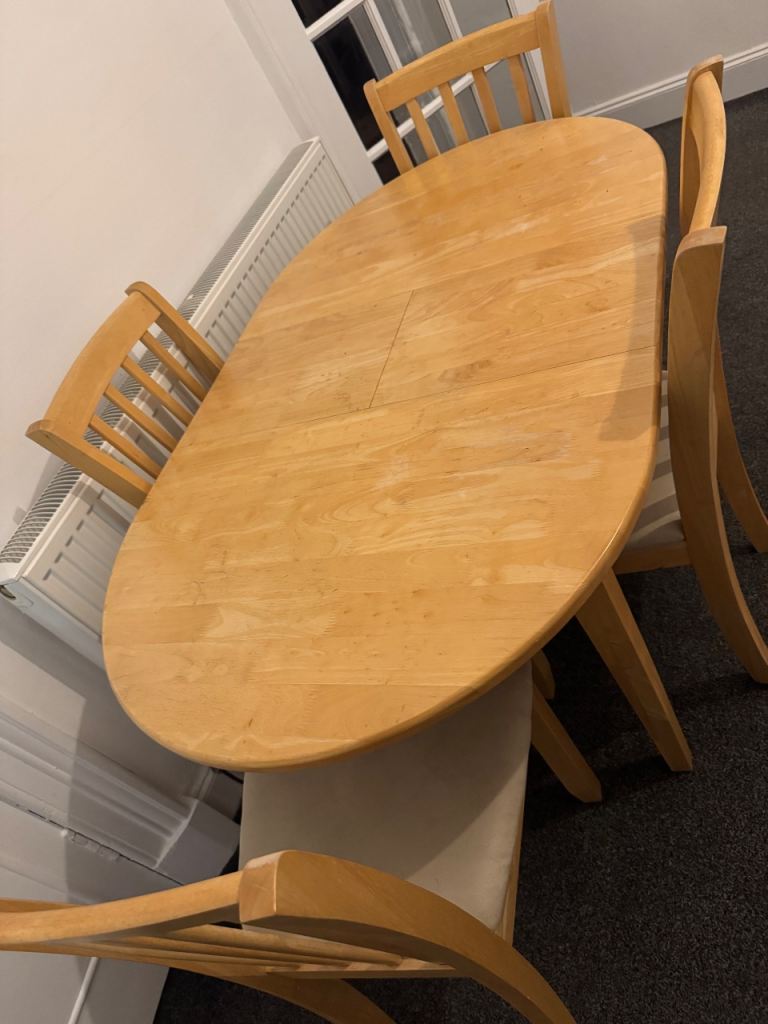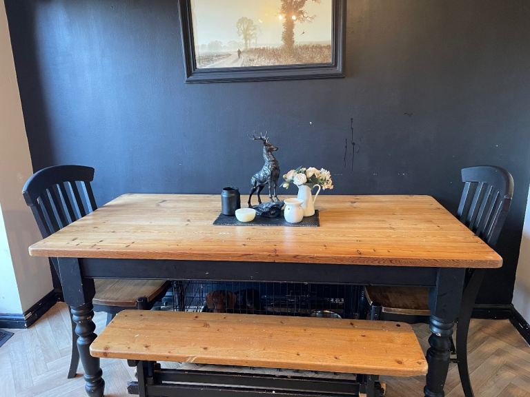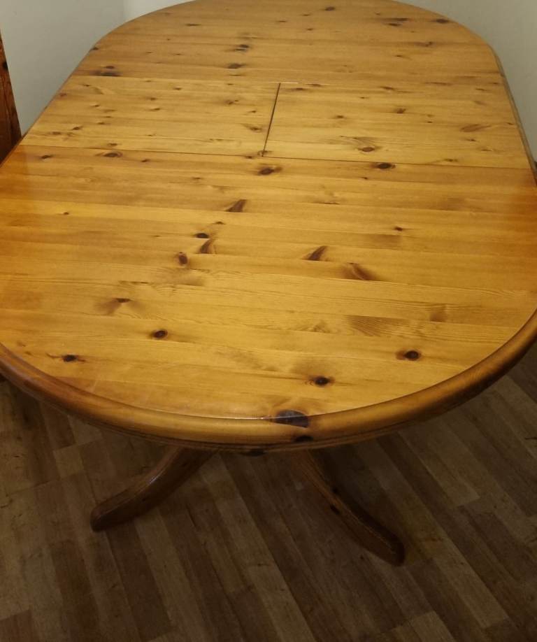 Really solid pine dining table. There are a few marks and scuffs on the table but it is a super sturdy table. And it’s very heavy! But it could be sanded down and stained. It easily adjusts to extend the table by about 40cm. Just not quite right for my new home. I’d advise 2 people to lift and you’ll need a van.