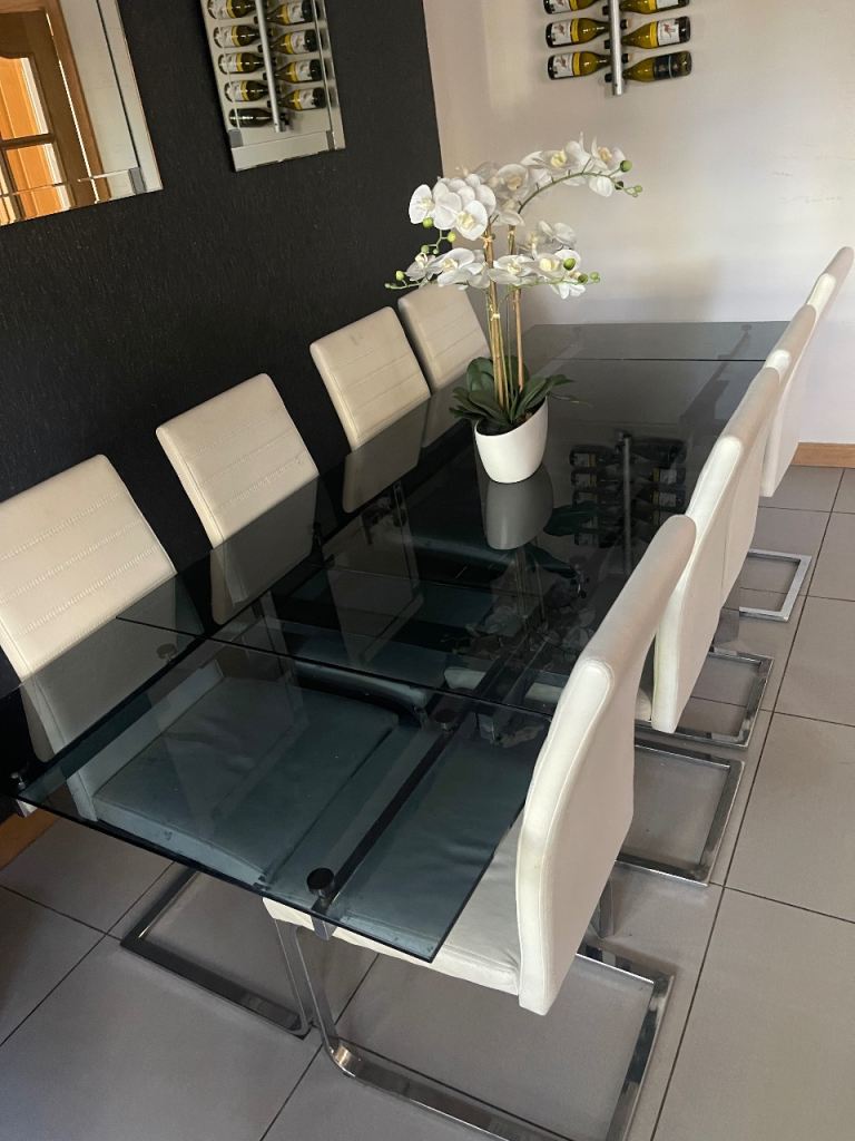 Beautiful tinted glass and chrome legs / frame. Extending dining table and 8 cream leather effect with chrome frames matching chairs. Table sizes Width 900mm length 1600mm but extends to 2400mm.