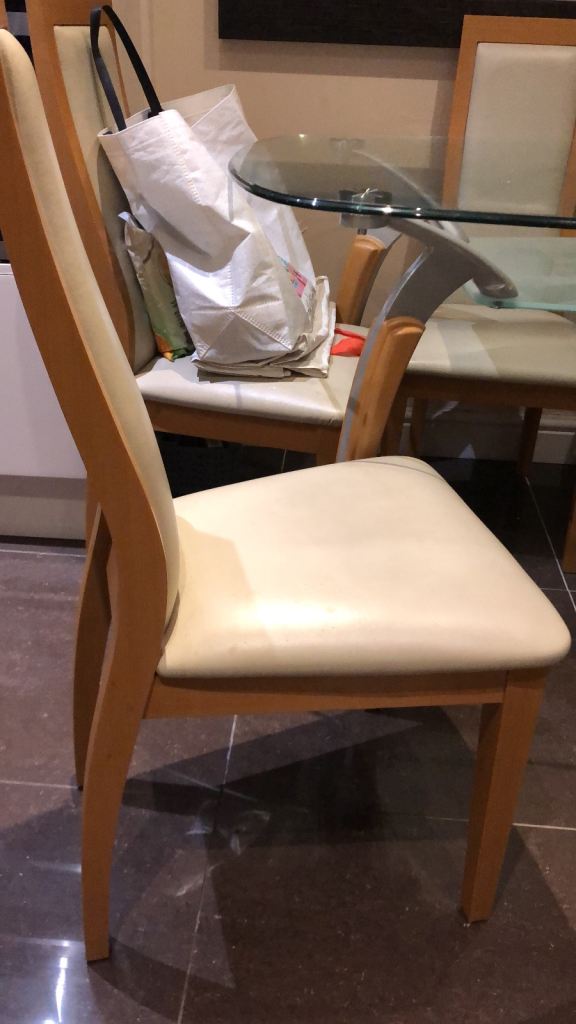 Matching chairs with cream leather affect seats and backrest.