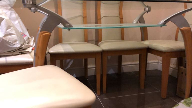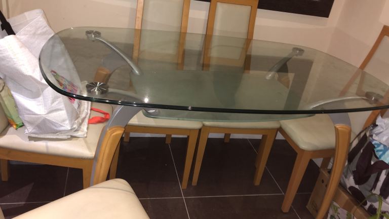 Beautiful double layer glass table with grey steel and beech wood affect frame dining table, no scratches on the glass as been protected by transparent cover.