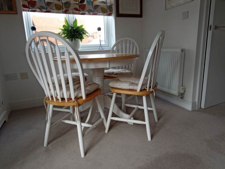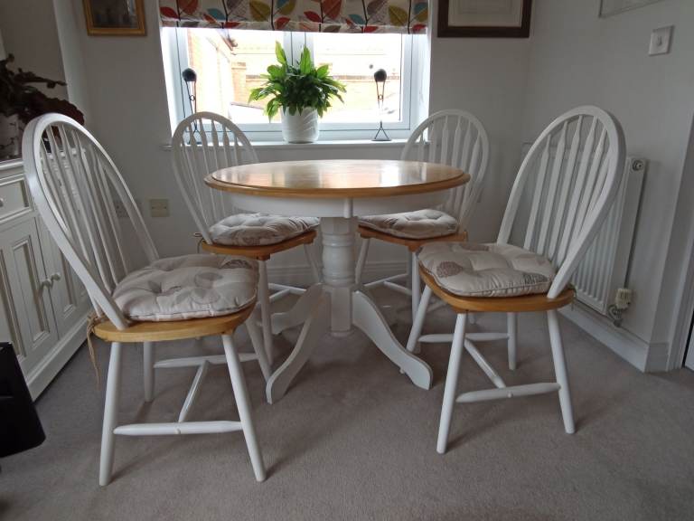 Lovely traditional, chic rustic farmhouse style, round dimmer table, 90cm diameter in pine top and white painted pedestal leg with four matching chairs. Sturdy design, rounded edges to the table top and sitting on four feet jutting from that central pedestal leg, this table will look fab in any modern home. Coushions included