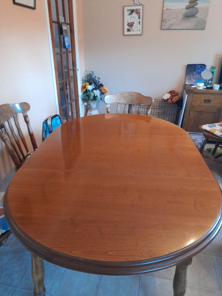 Solid extended dinning room table with six chairs. Chairs lightened slightly with the sun. Table small round ,which can be extended to get more people around it.