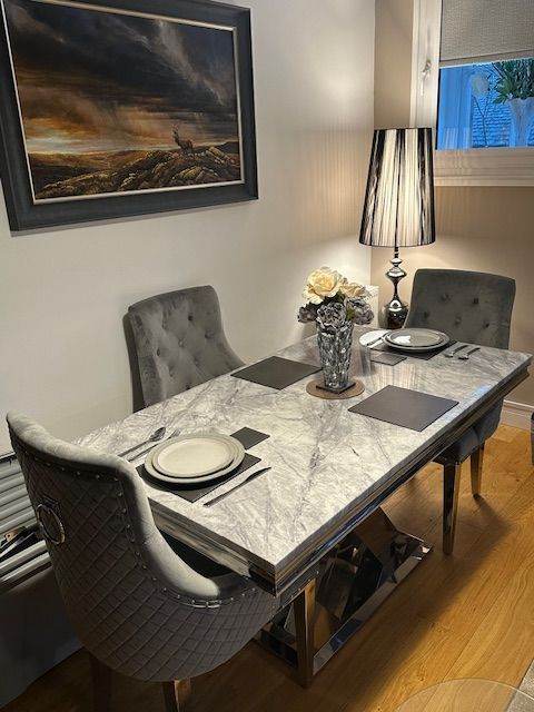 A Dolce solid marble table and 4 chairs to match set for sale. Reason for sale is due to down sizing of property that it does not fit in living room. Condition is immaculate along with chairs as if just delivered from warehouse.