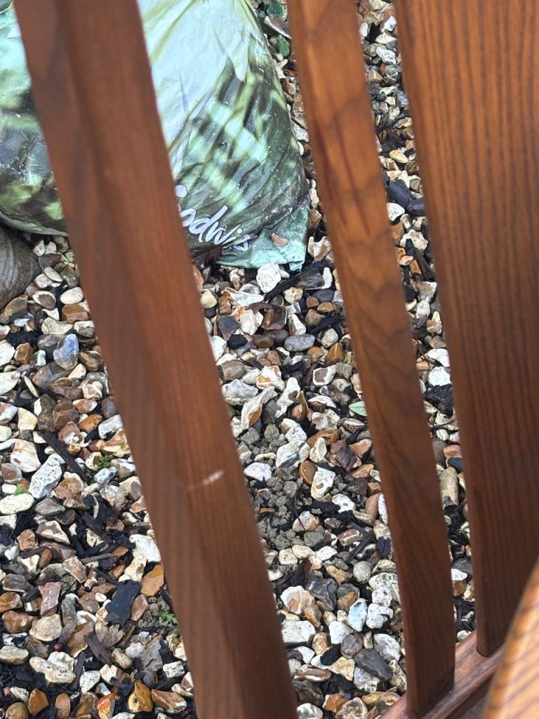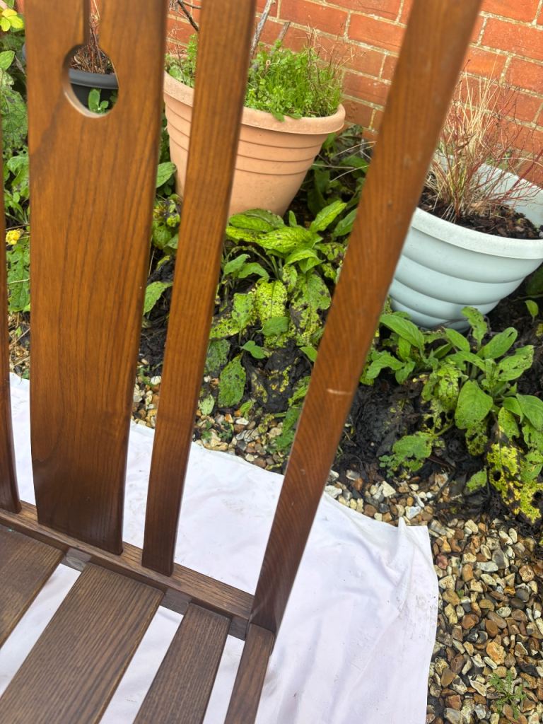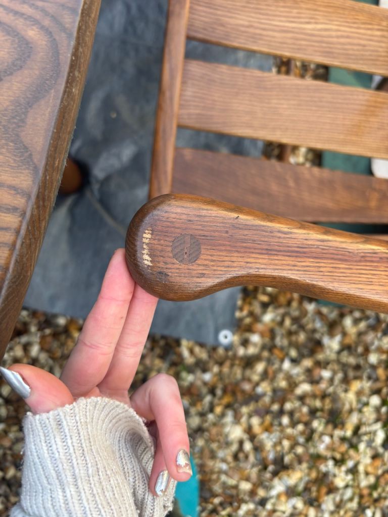 X2 chairs without arms (one has a little wooden knob missing from the very top, pictured).