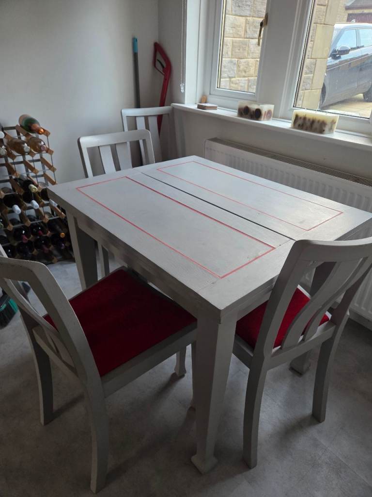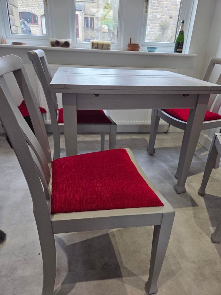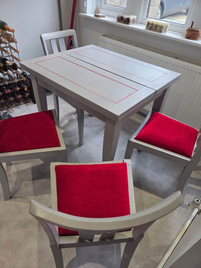 Refurbished antique oak table and chairs - painted grey with a red finish.