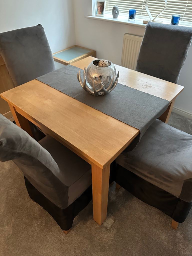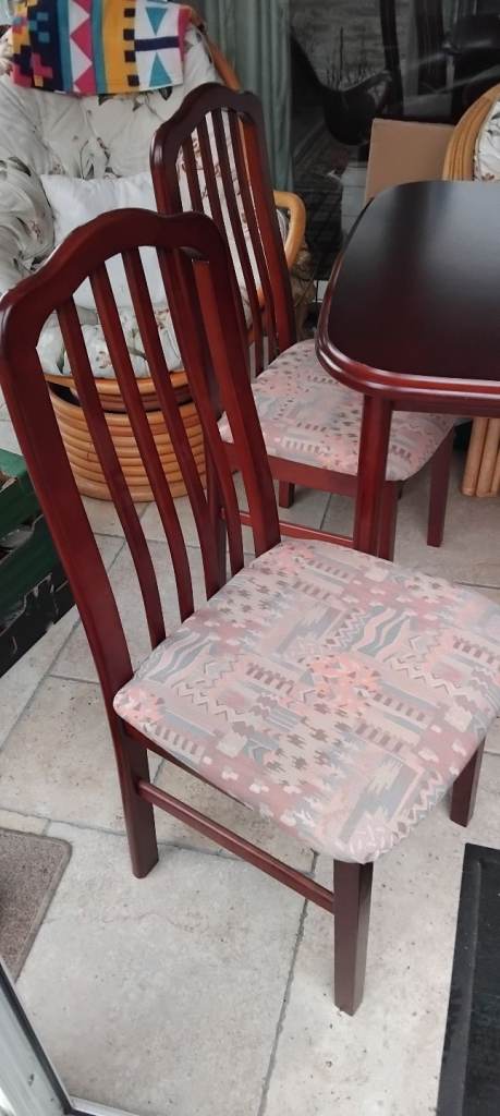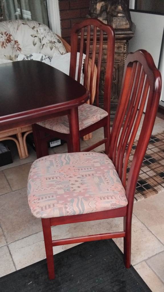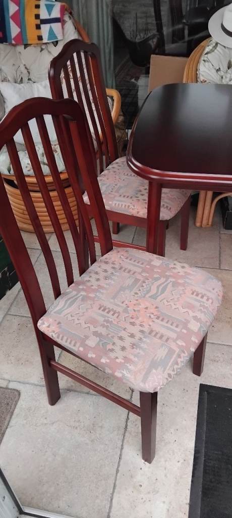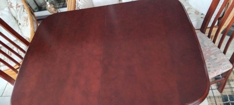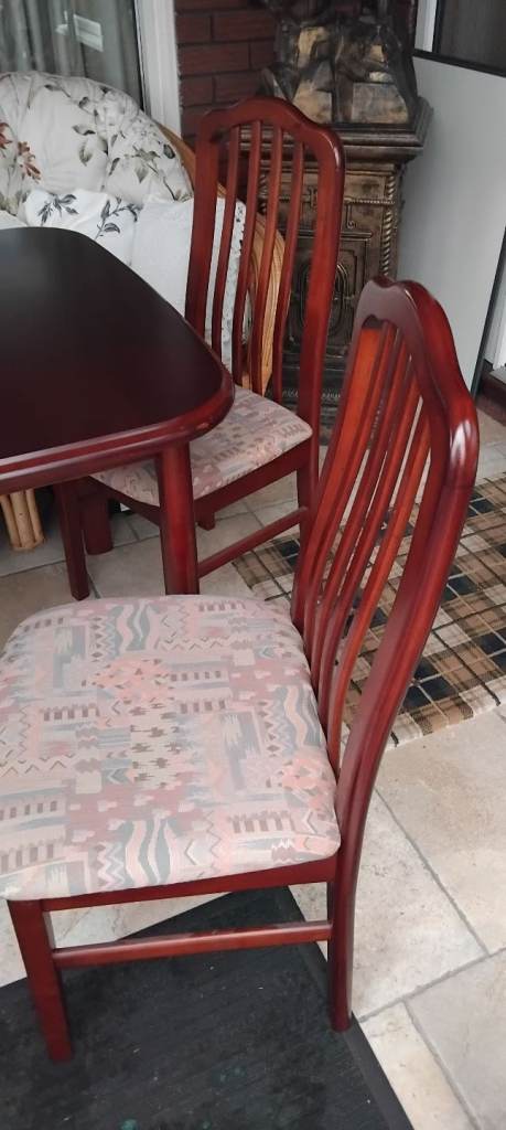 Extendable dining table and four chairs well made and in excellent condition no issues at all ... lovely medium satin mahogany colour.