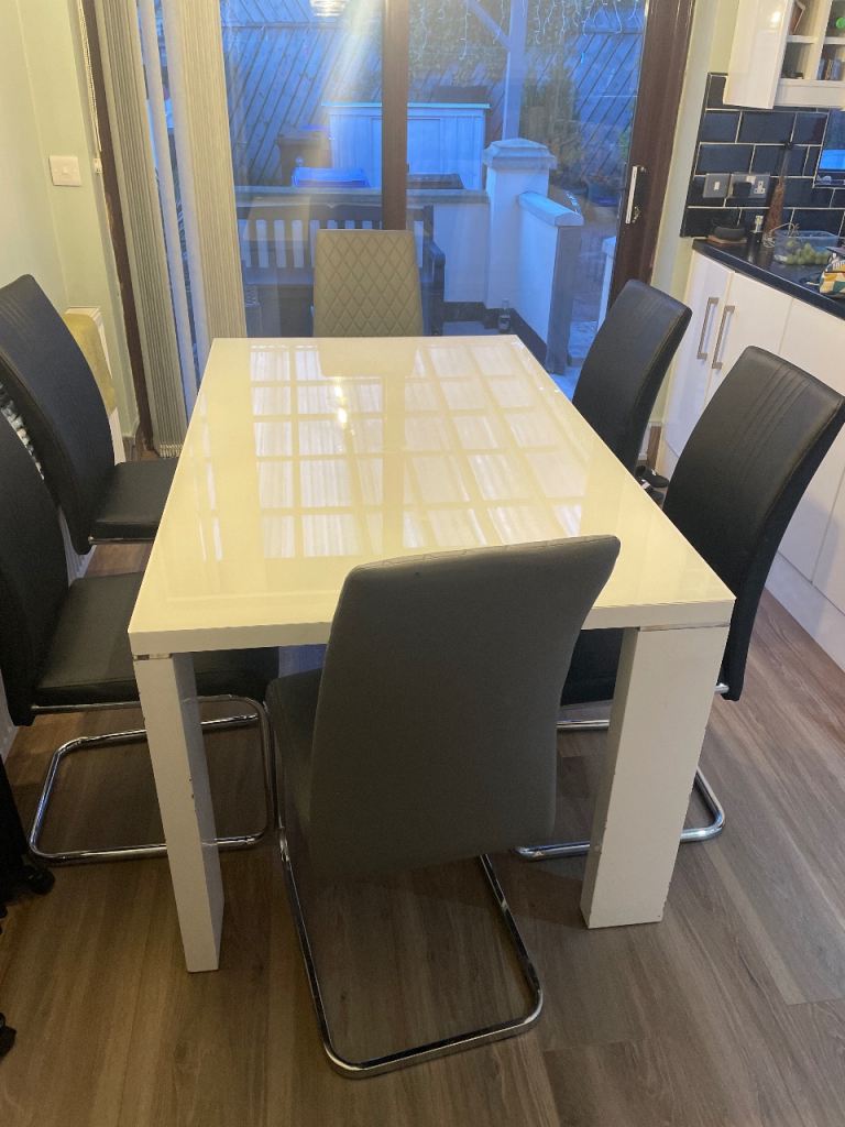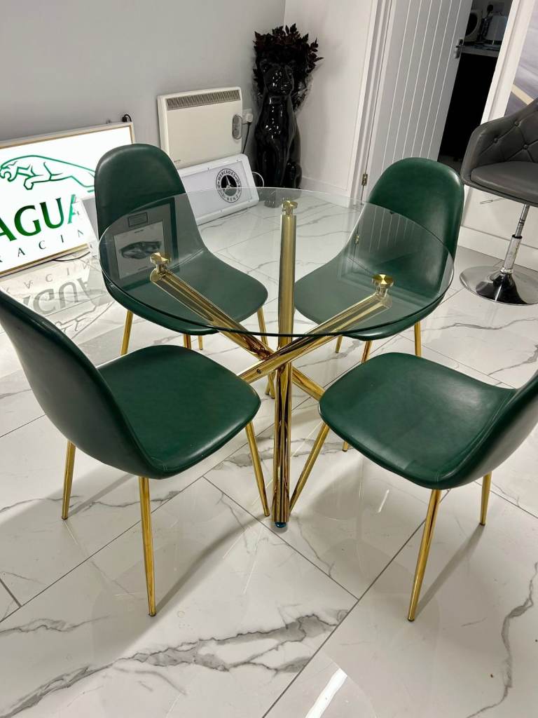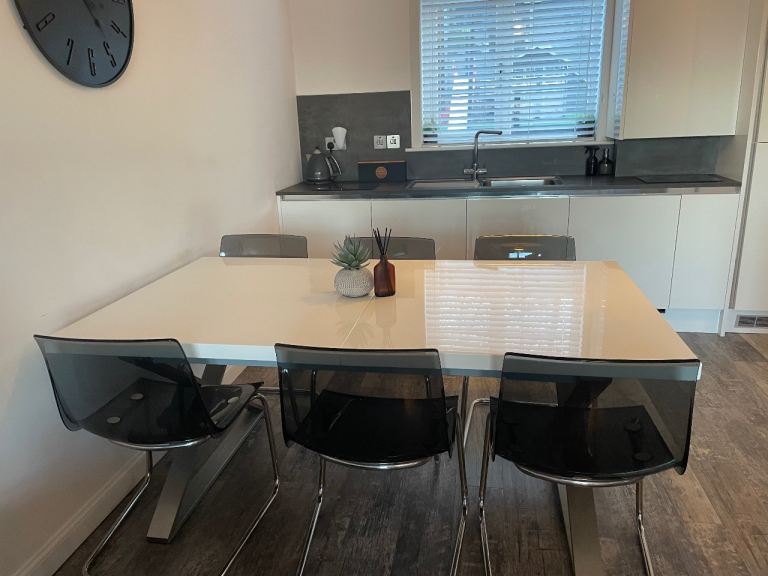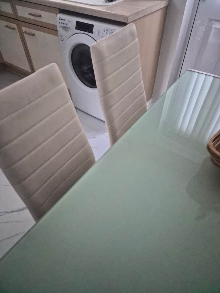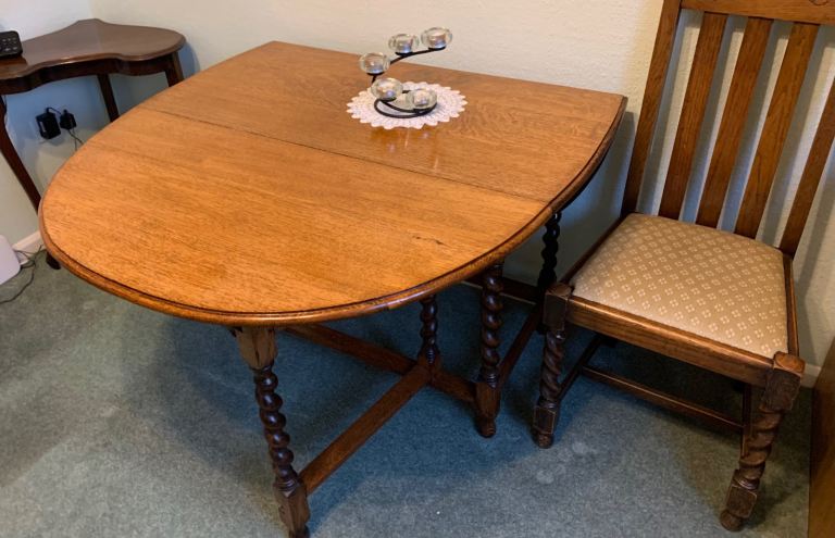 Extendable dining table and four chairs well made and in excellent condition no issues at all ... lovely medium satin mahogany colour.