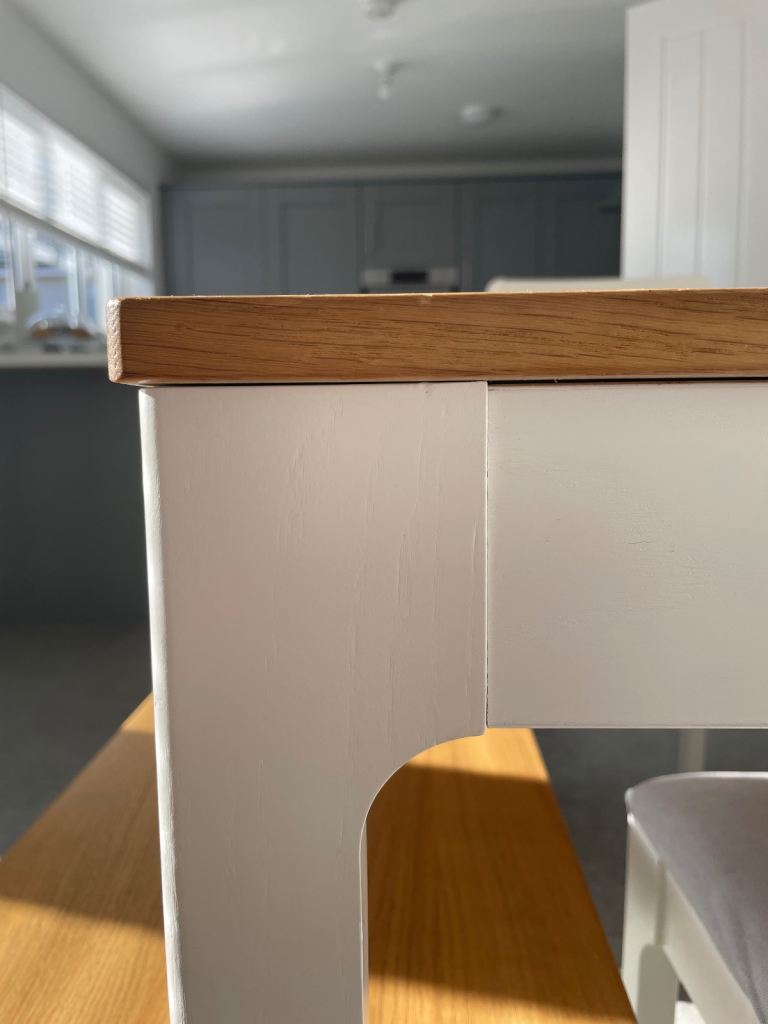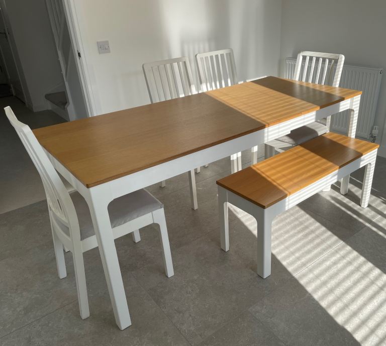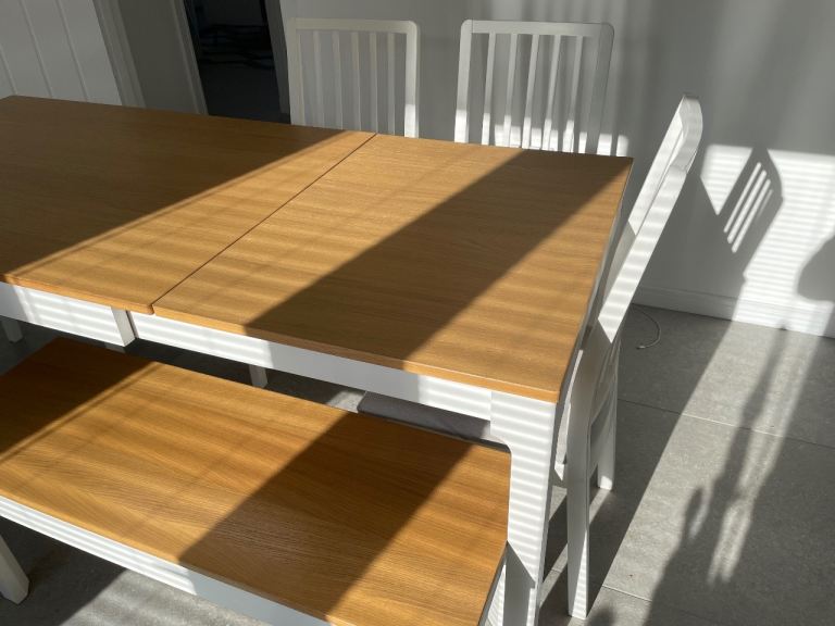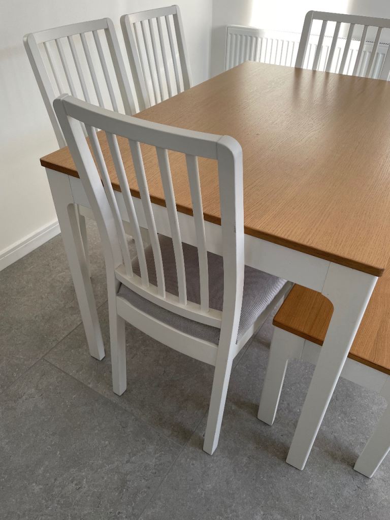 Excellent condition white wood dining table, four chairs with grey colour cushions and bench. Items ready to be collected upon agreement.