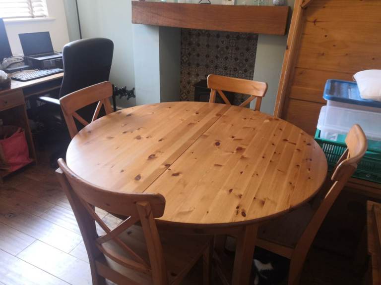 Extendable Round Dining Table with 4 Chairs for sale in great condition. Solid wood round table that extends in thr middle. 4 chairs included. Selling due to downsizing and no room for it. Collection only due to size