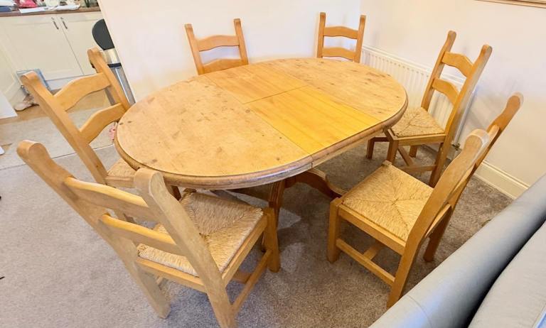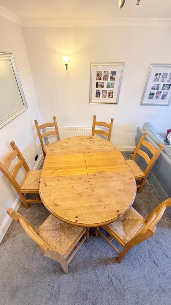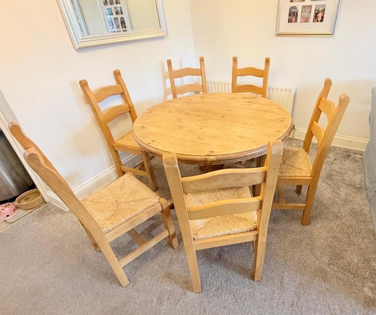 Pine extending dining table and 6 chairs