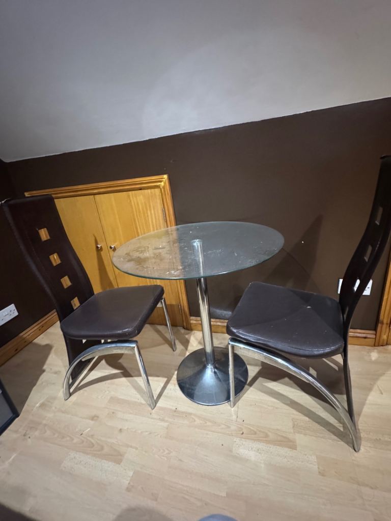 Table in excellent condition,but chairs can do with a little t.l.c. ( recovered seatpads) also three door, three drawer sideboard almost a match with table and chairs. Lovely storage for diningroom items.
