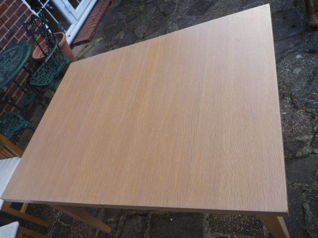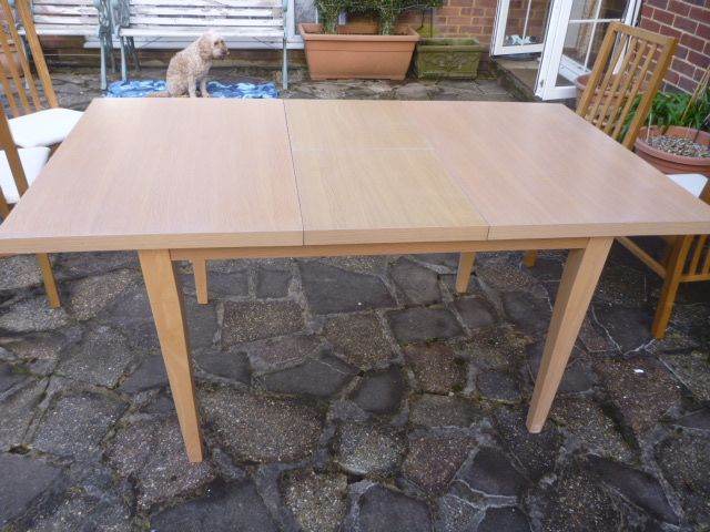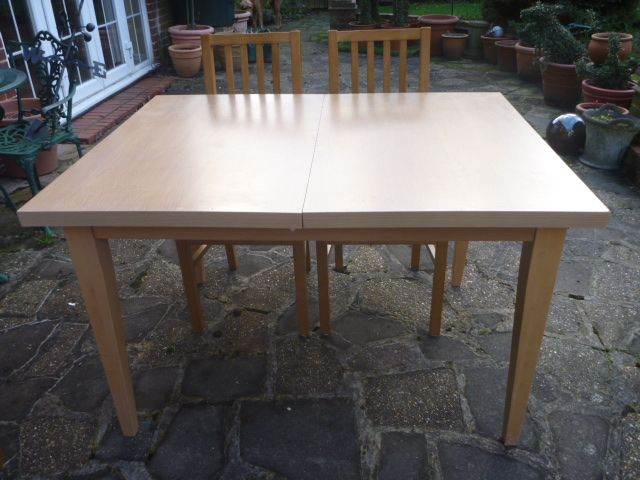 An extending light wood dining table, measuring 90 x 120 cm. It can be extended to 90 x 160 cm, the extension piece sits neatly underneath. Top surface is in good condition.