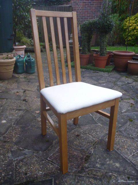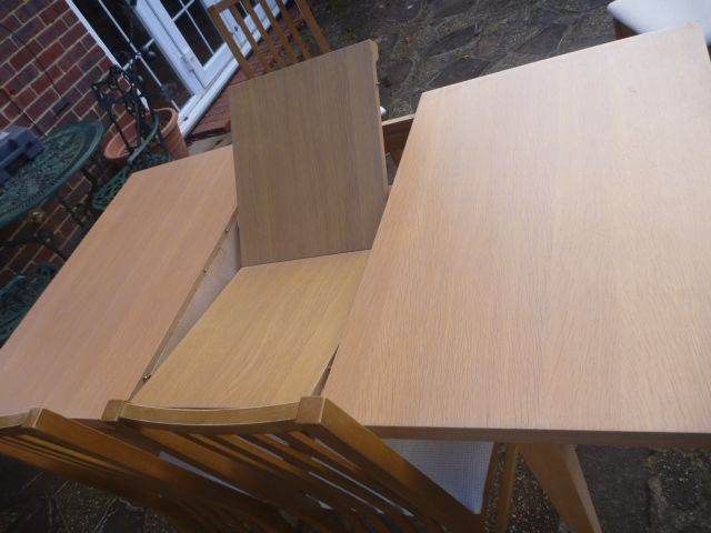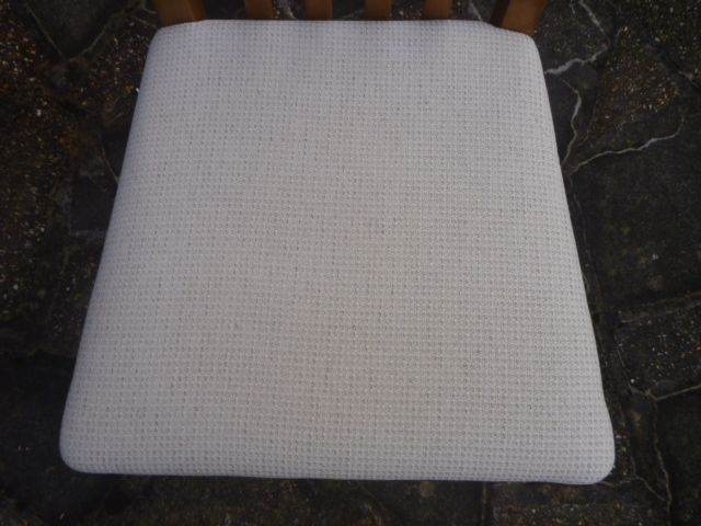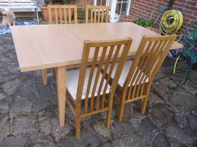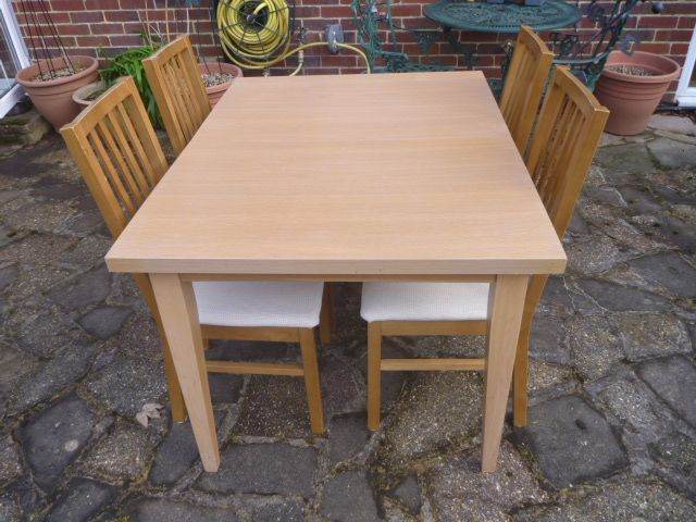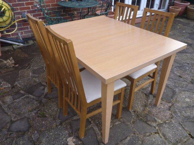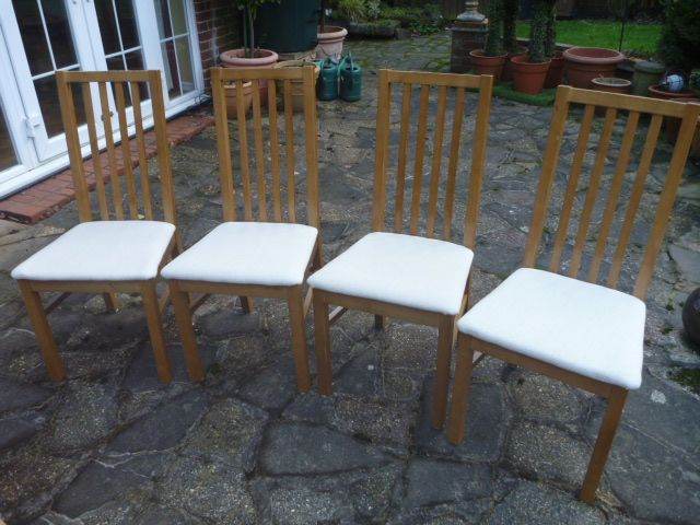Comes with 4 dining chairs with cream upholstered seat pads, spotlessly clean and do not wobble.