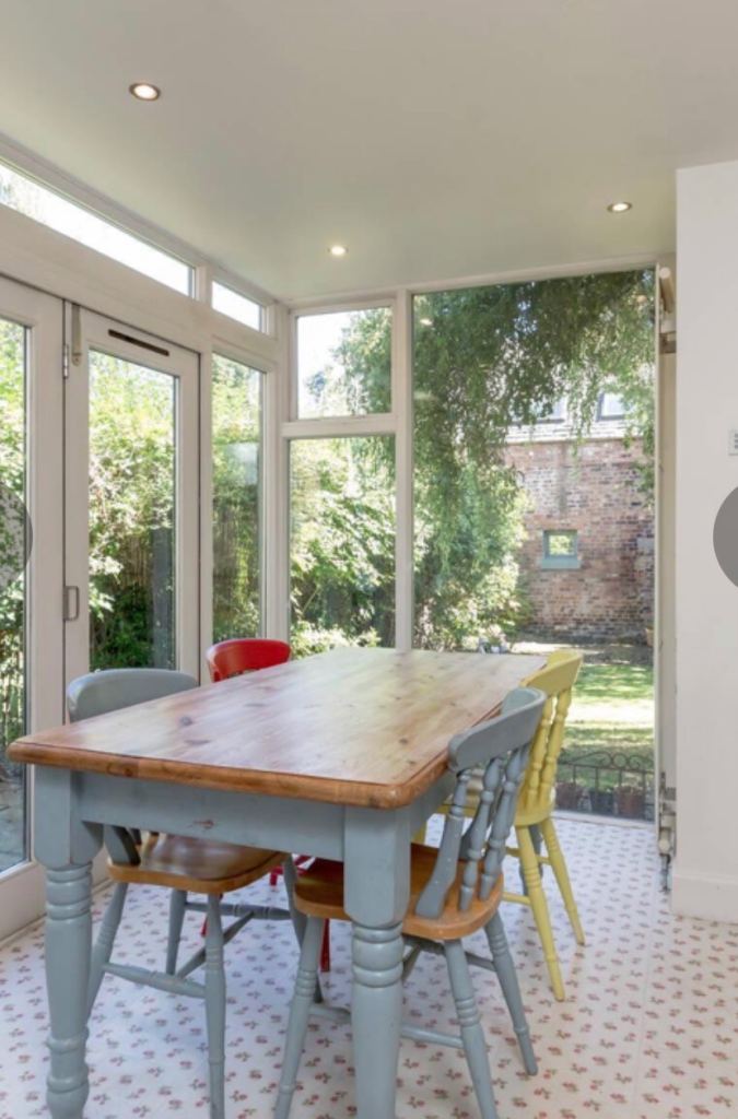 Lovely solid pine farmhouse-style table and 4 chairs painted in individual colours. Can be easily painted for a makeover to suit buyer’s preference.