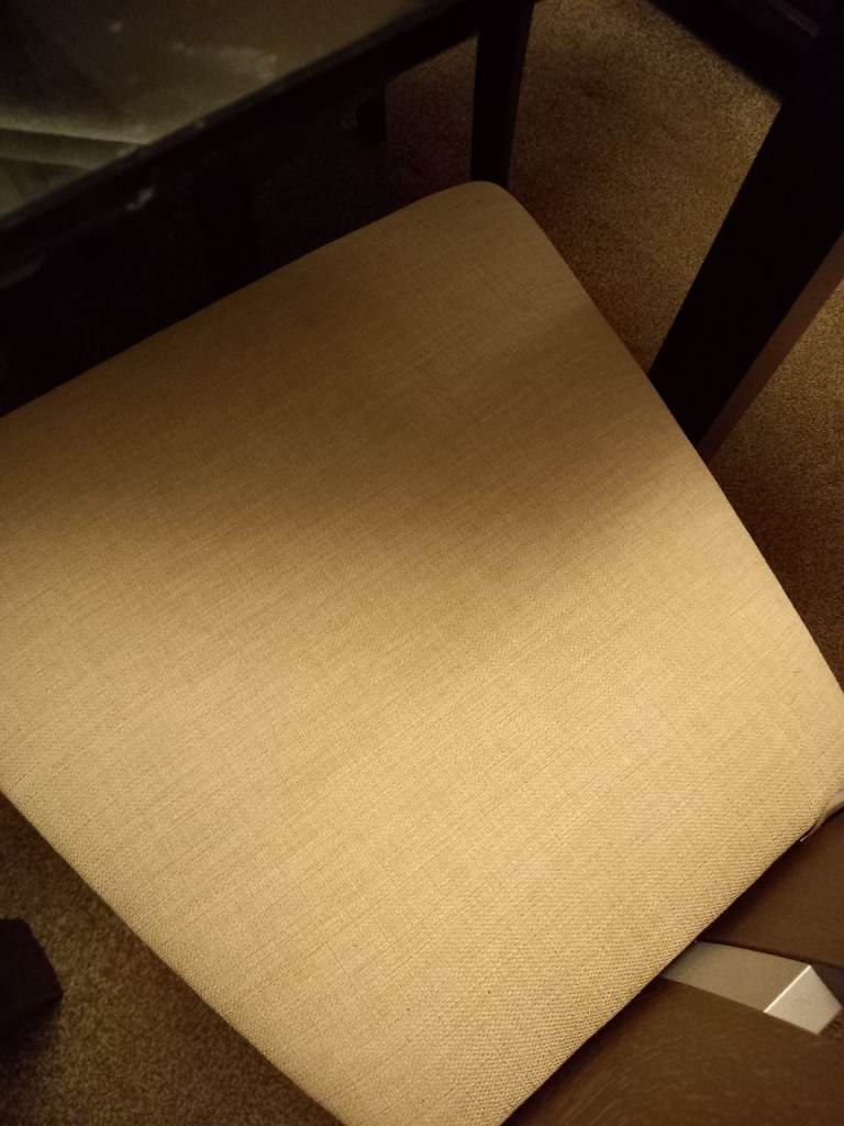 Glass and wood table with 6 chairs. Excellent condition. Top always covered. Chairs are excellent condition.