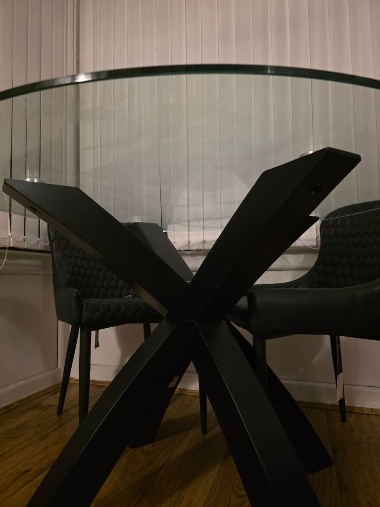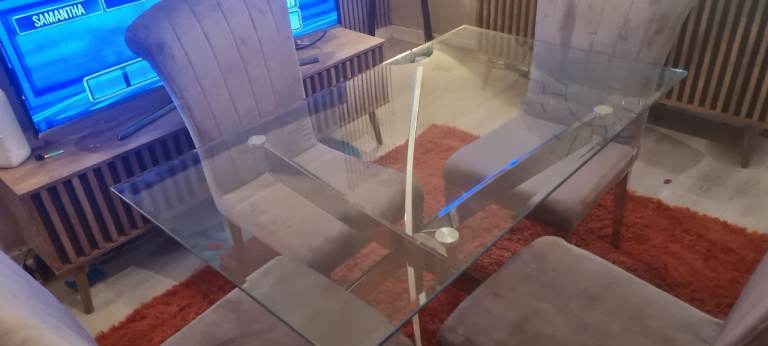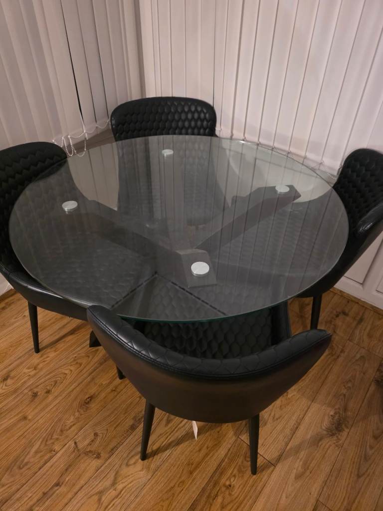 Round glass table and 4 chairs for sale. Hardly used, excellent condition.