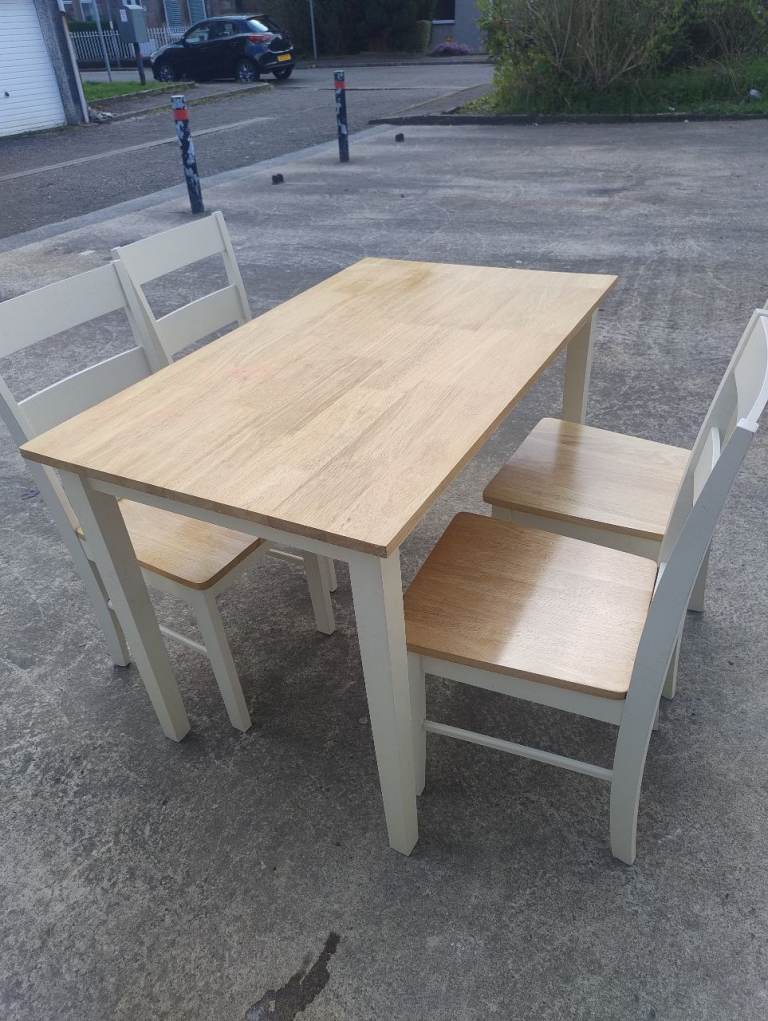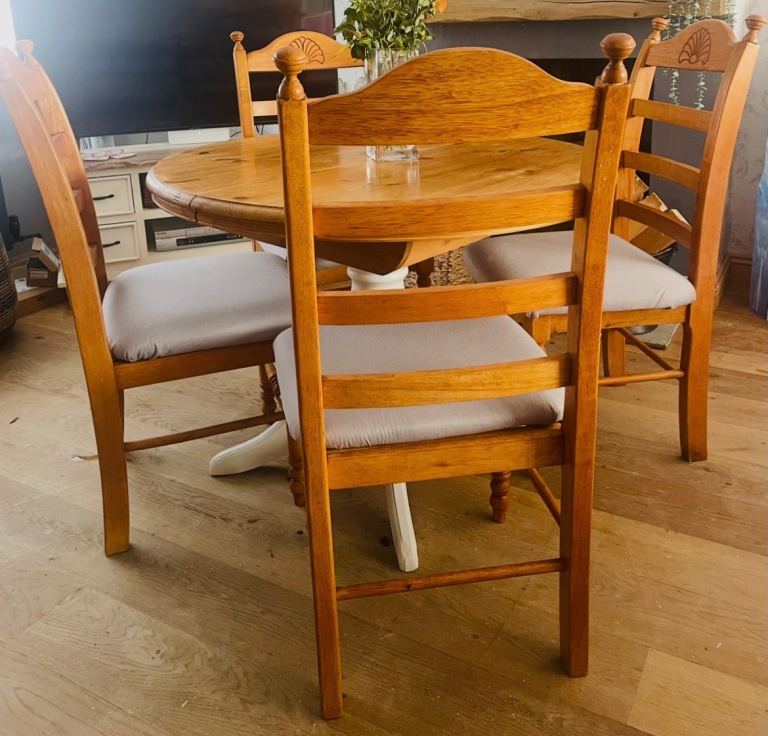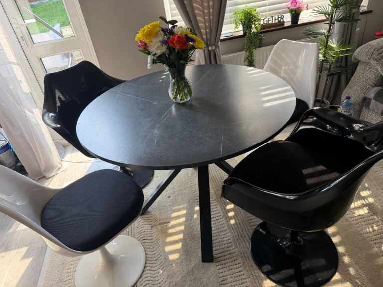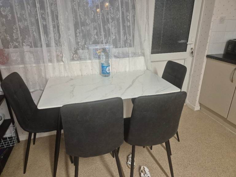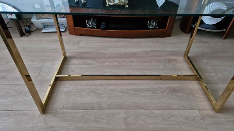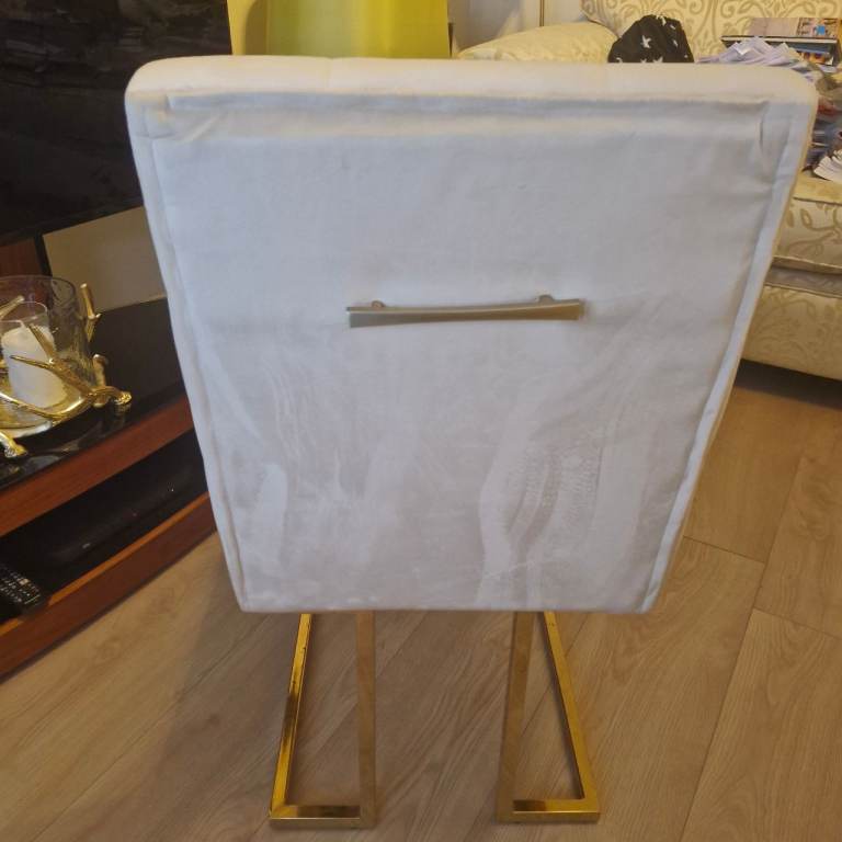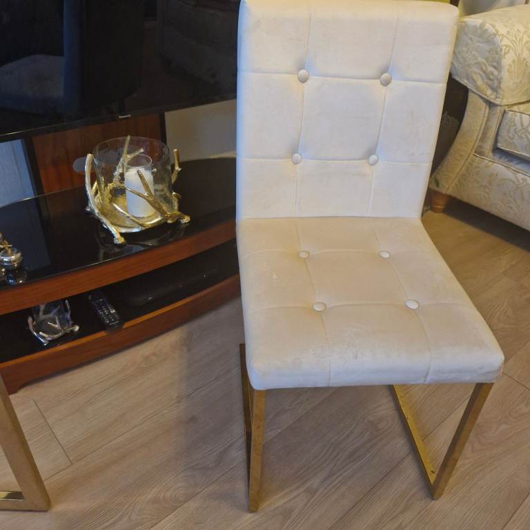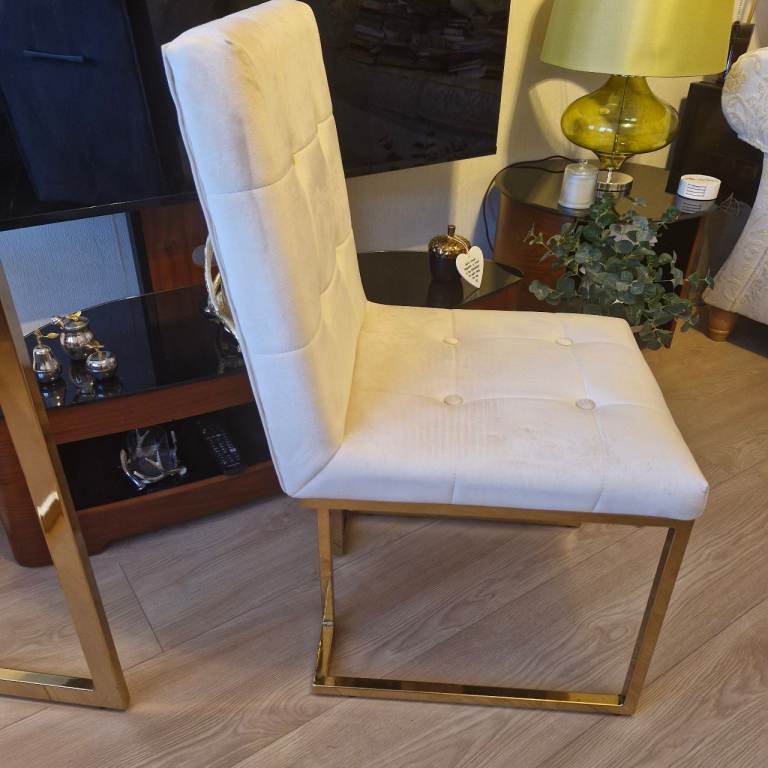 As new this glass top dining table with gold coloured legs and 4 matching cream velvet chairs are in pristine condition.