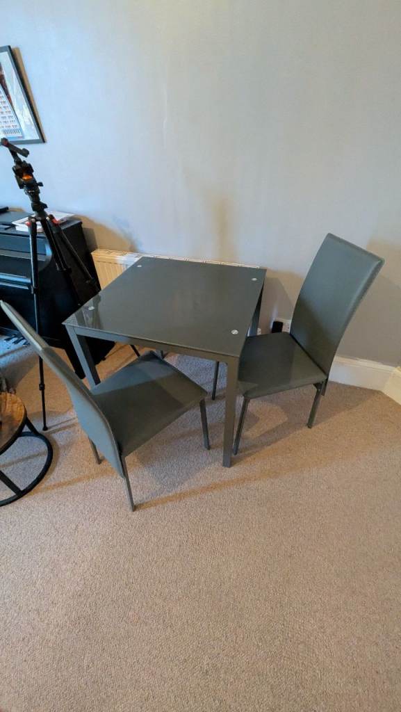 Grey table and chairs. Glass table.
