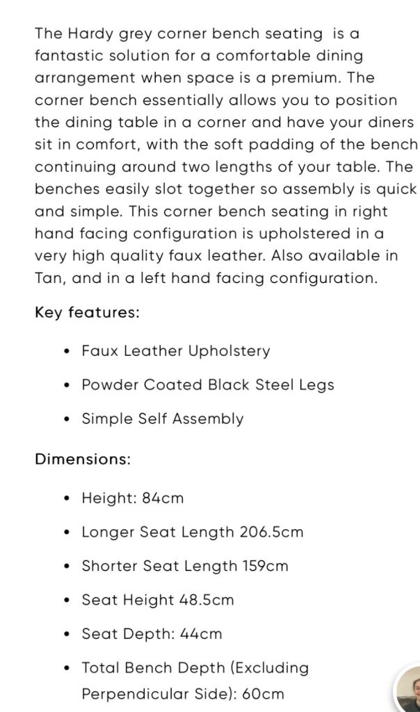 Hardy Corner Bench Unit Right Hand Facing. Unit made up ready for transport. Easy to assemble Purchased May 2025 no longer required. A very comfortable Sturdy high quality faux Leather sprung seating unit in a Grey mix finish. Supports made in Continuous Black Steel tubing light and strong.