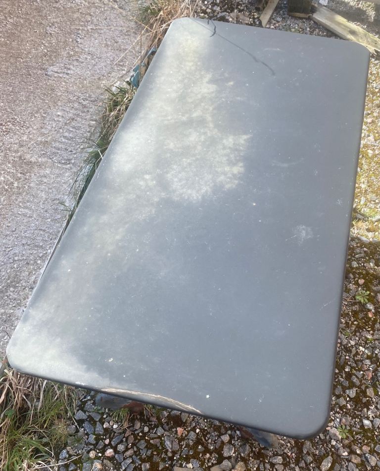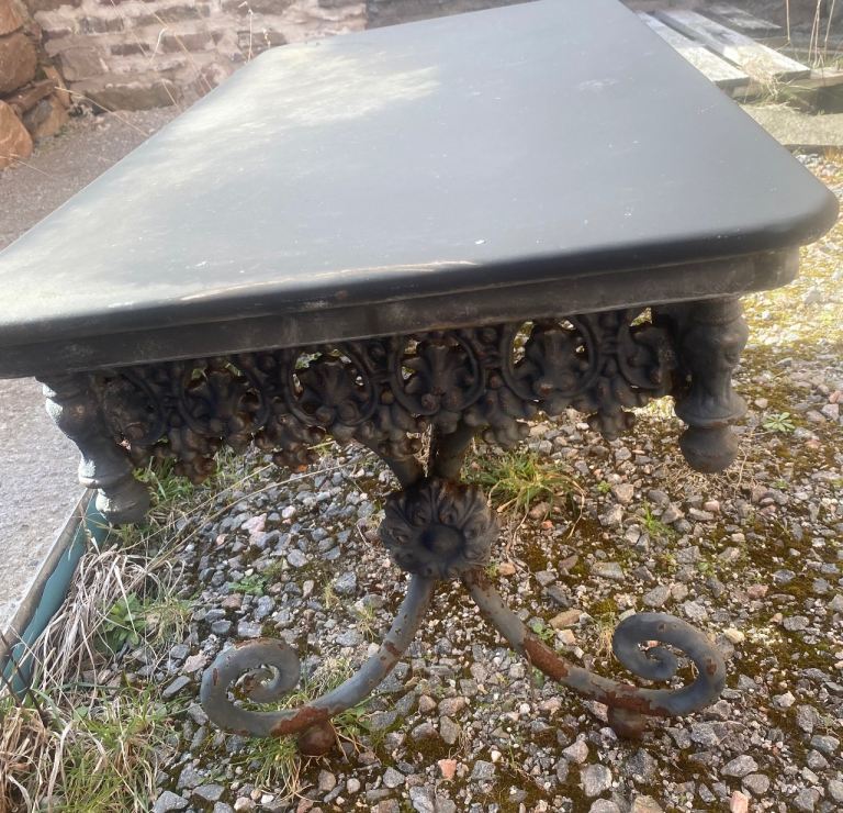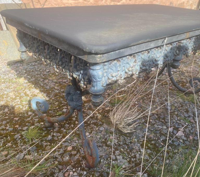 I bought this for £300 from Brodie Countryfare a few years ago. In great barely used condition but it needs a thorough clean and the legs repainted. Lovely ornate vintage detailing on the base. It is really heavy which is the main reason why I bought it as I knew it wouldn’t get blown over in the wind. I used it as an outdoor coffee table but it was sold as a bench and it’s definitely strong enough to take the weight of 2. Measures 94cm long x 49cm wide by 47cm high.