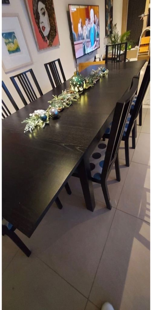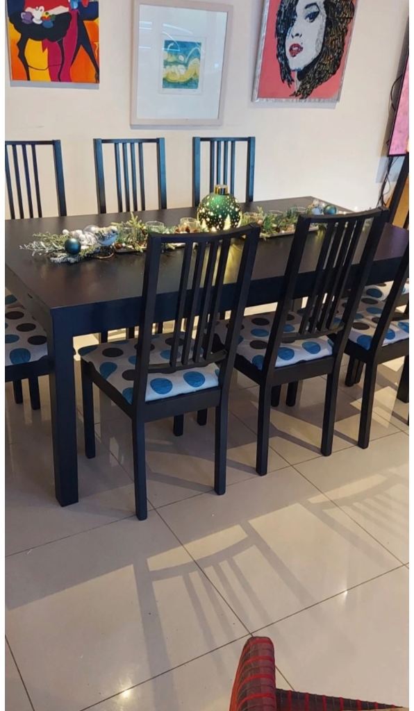 Stylish IKEA dining set including a large rectangular table and 8 matching chairs in dark wood/black finish.